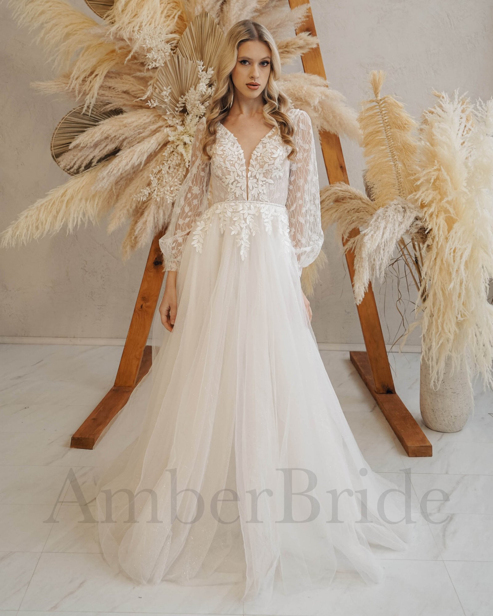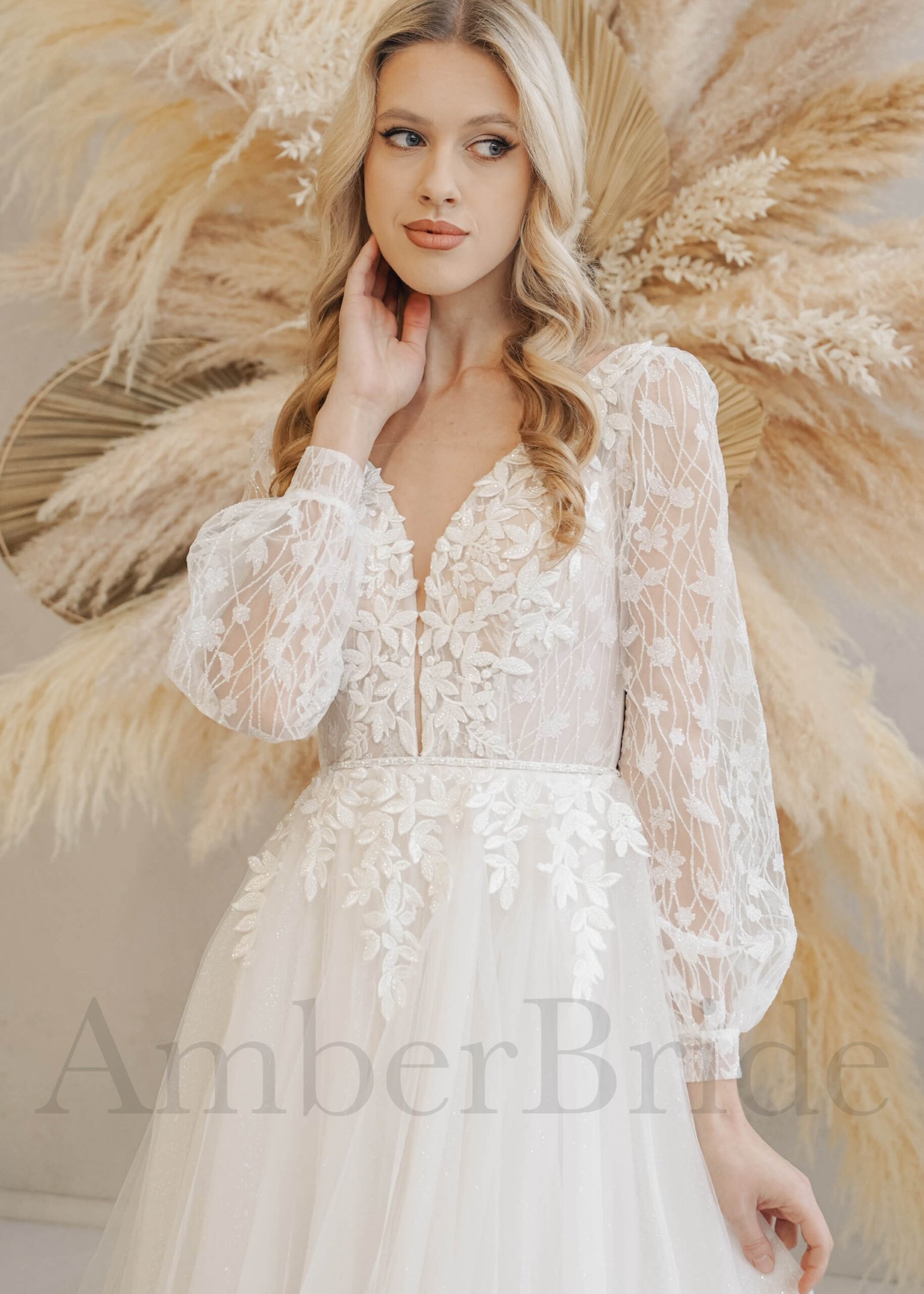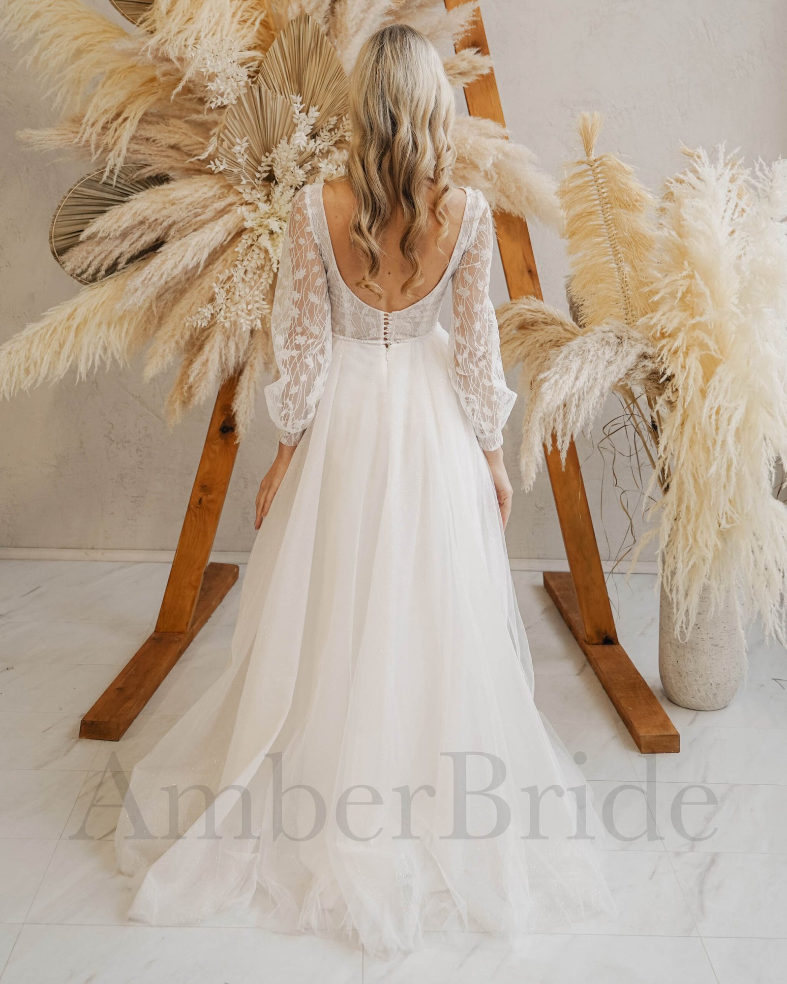 Bohemiška tulio vestuvinė suknelė su ilgomis rankovėmis