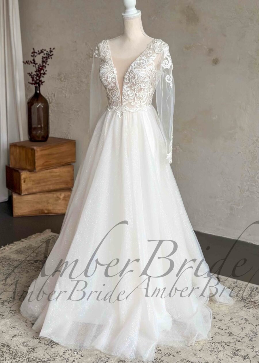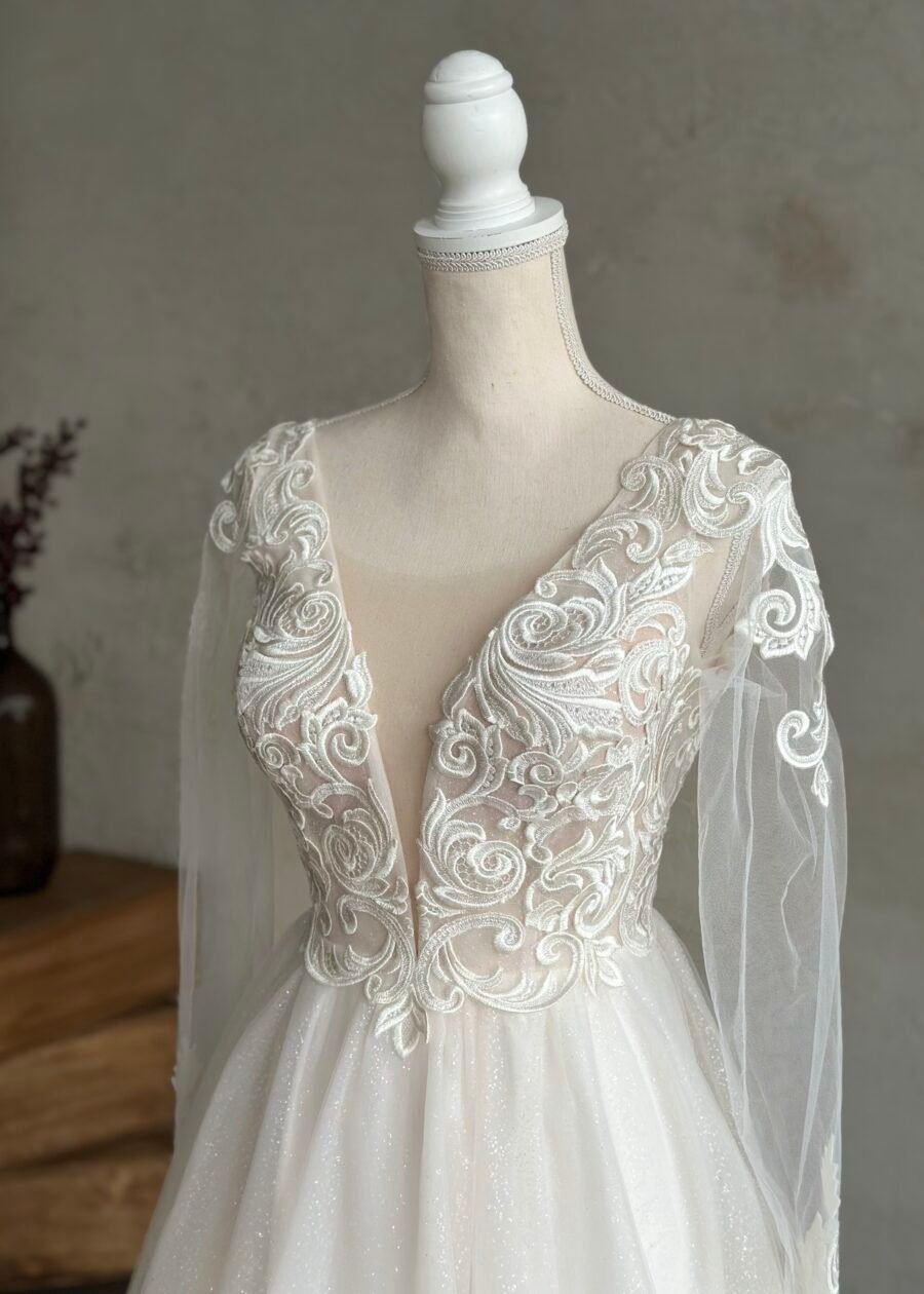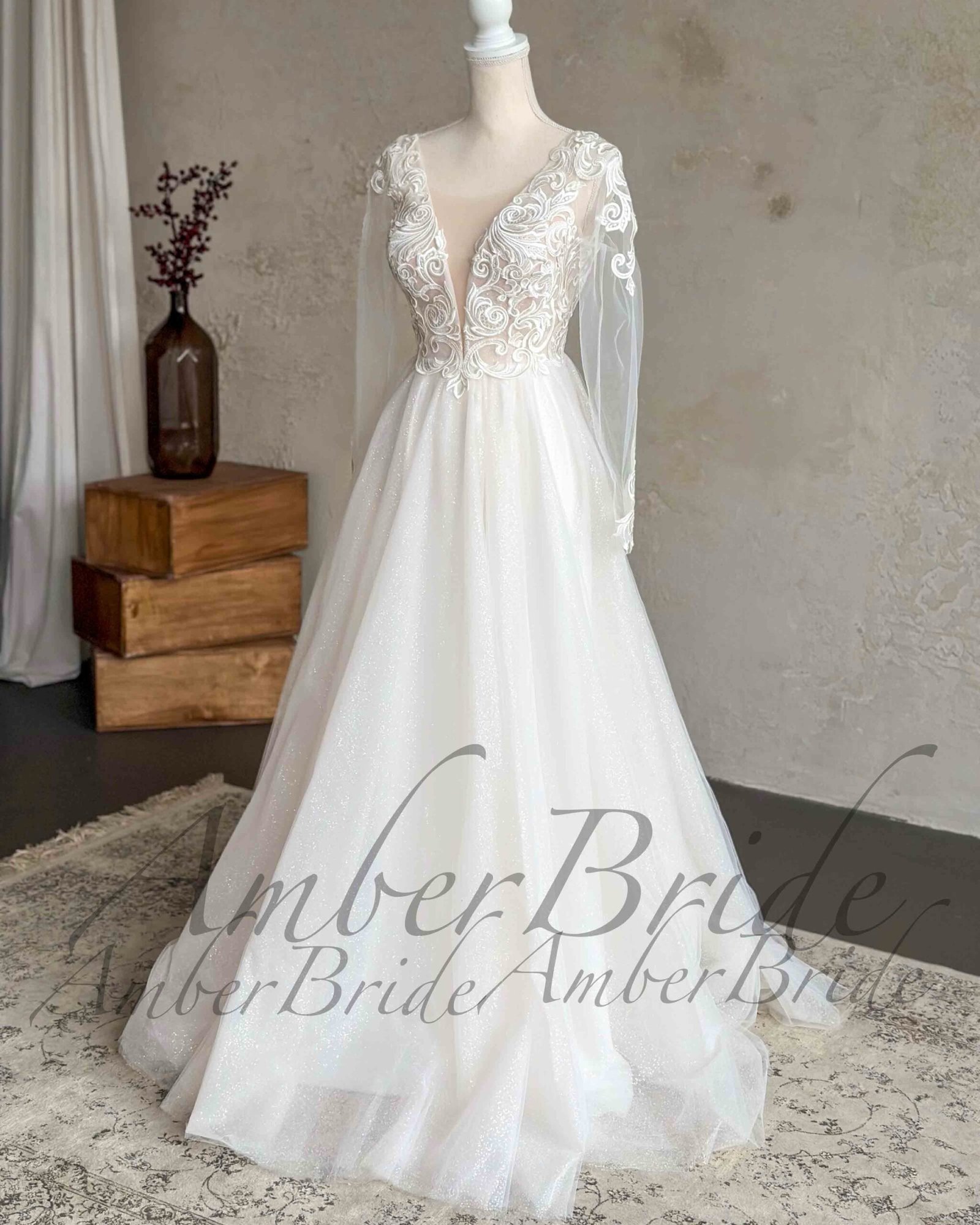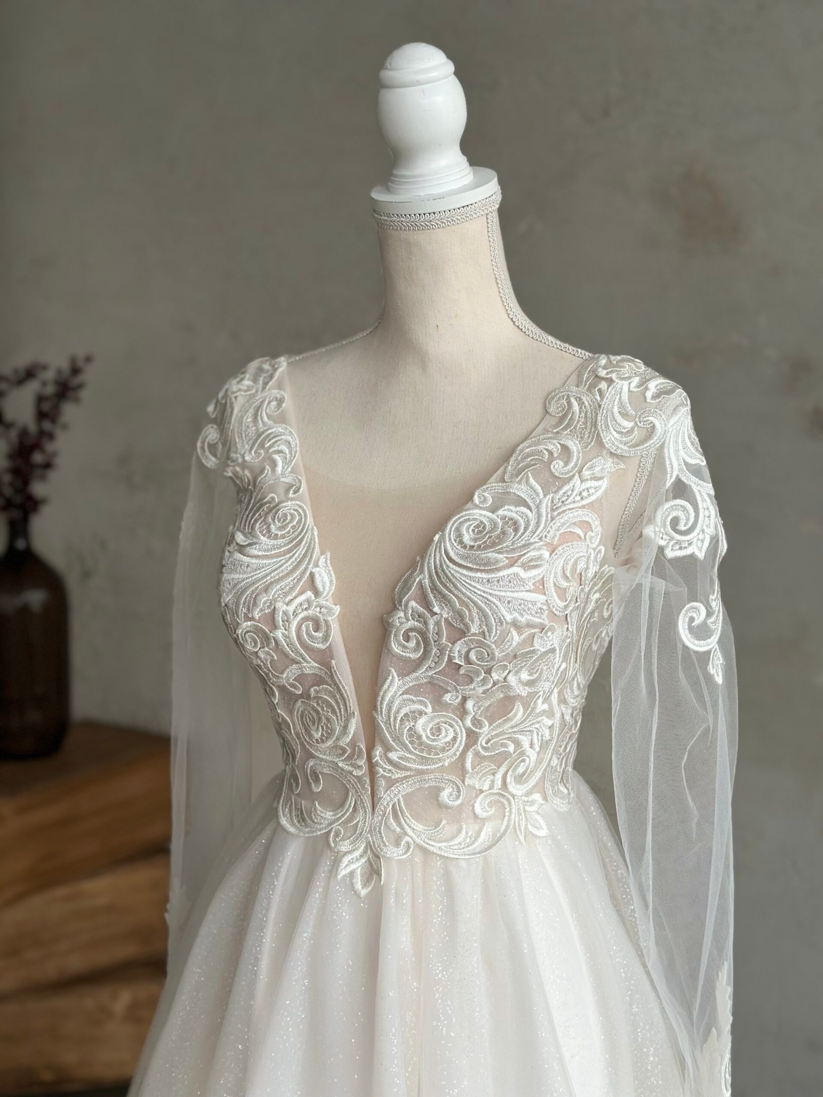Bohemiška tulio vestuvinė suknelė su ilgomis rankovėmis