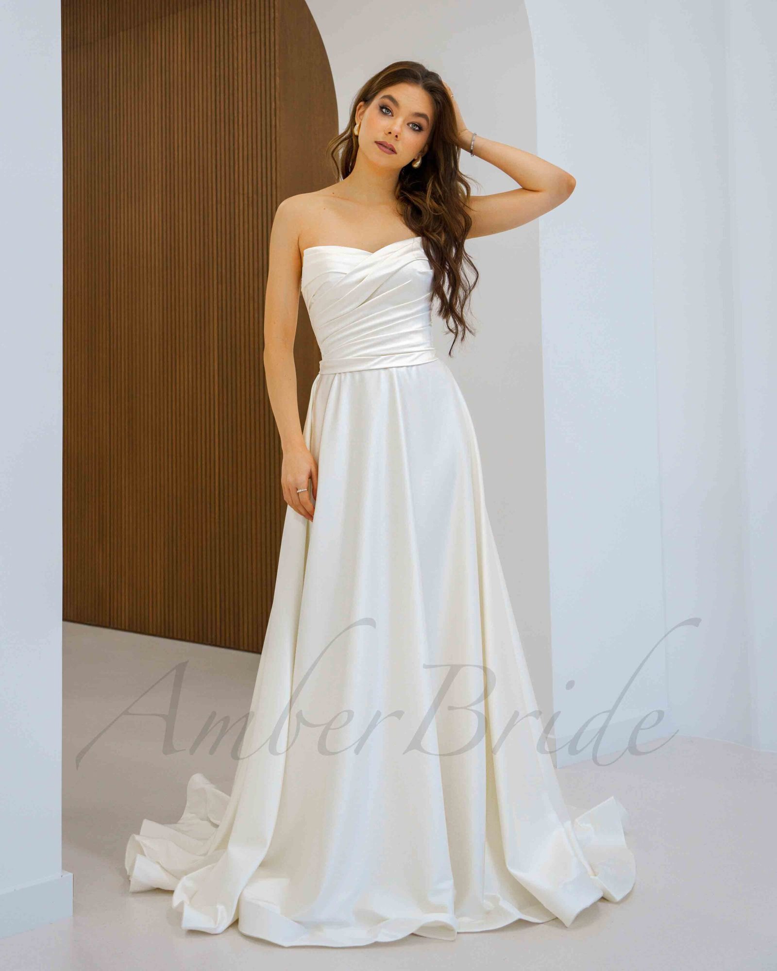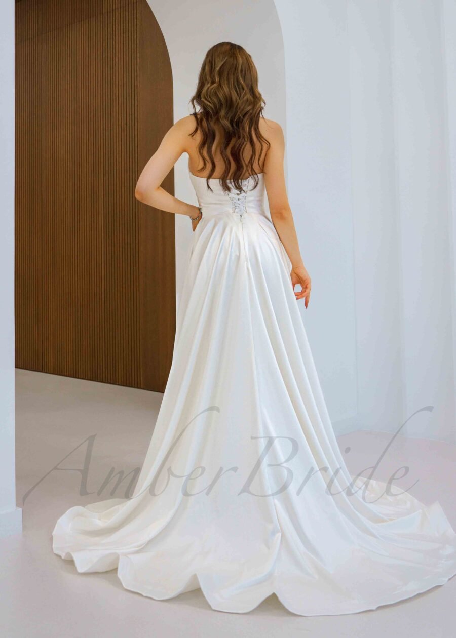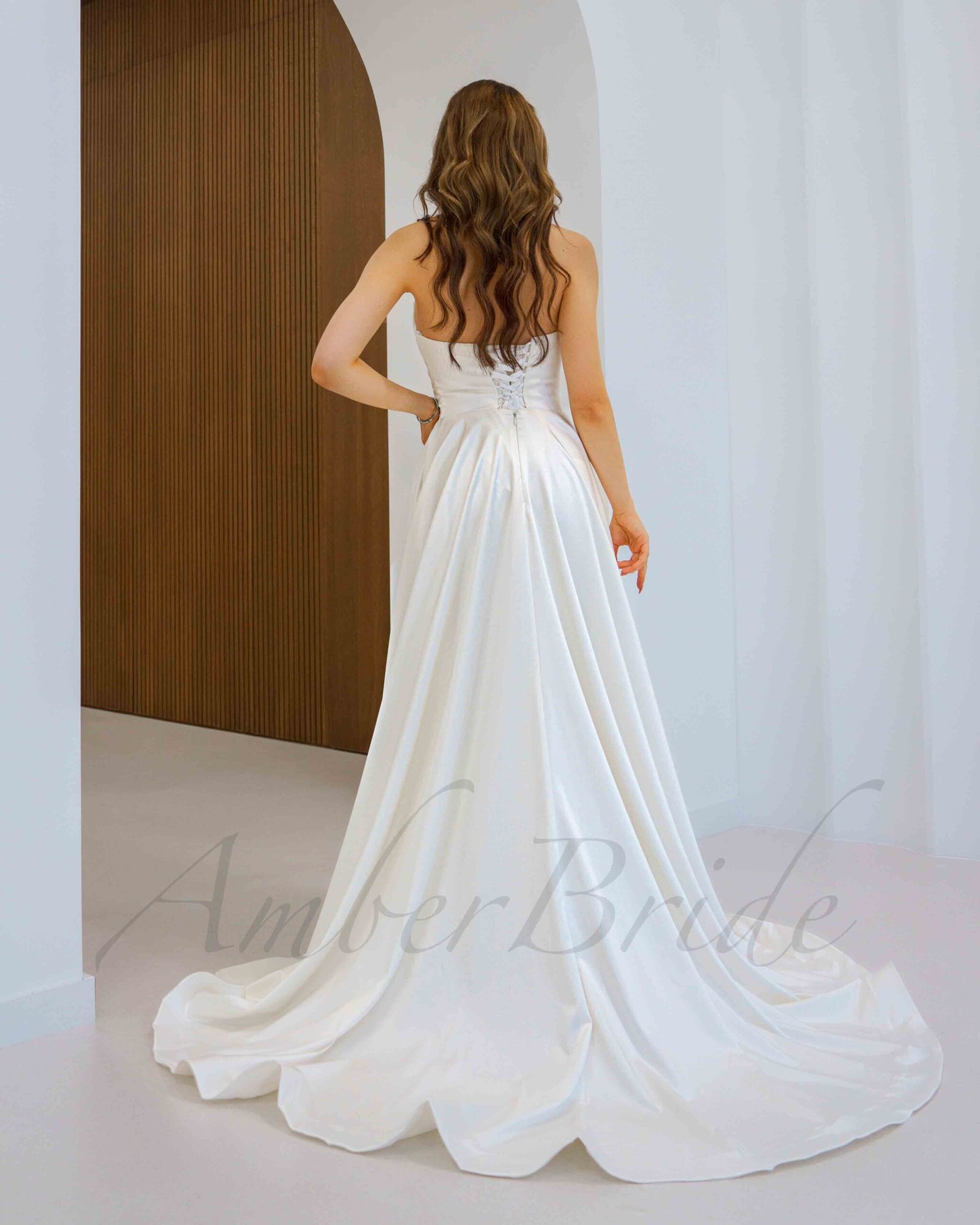Klasikinė blizgaus satino vestuvinė suknelė su V formos liemeniu