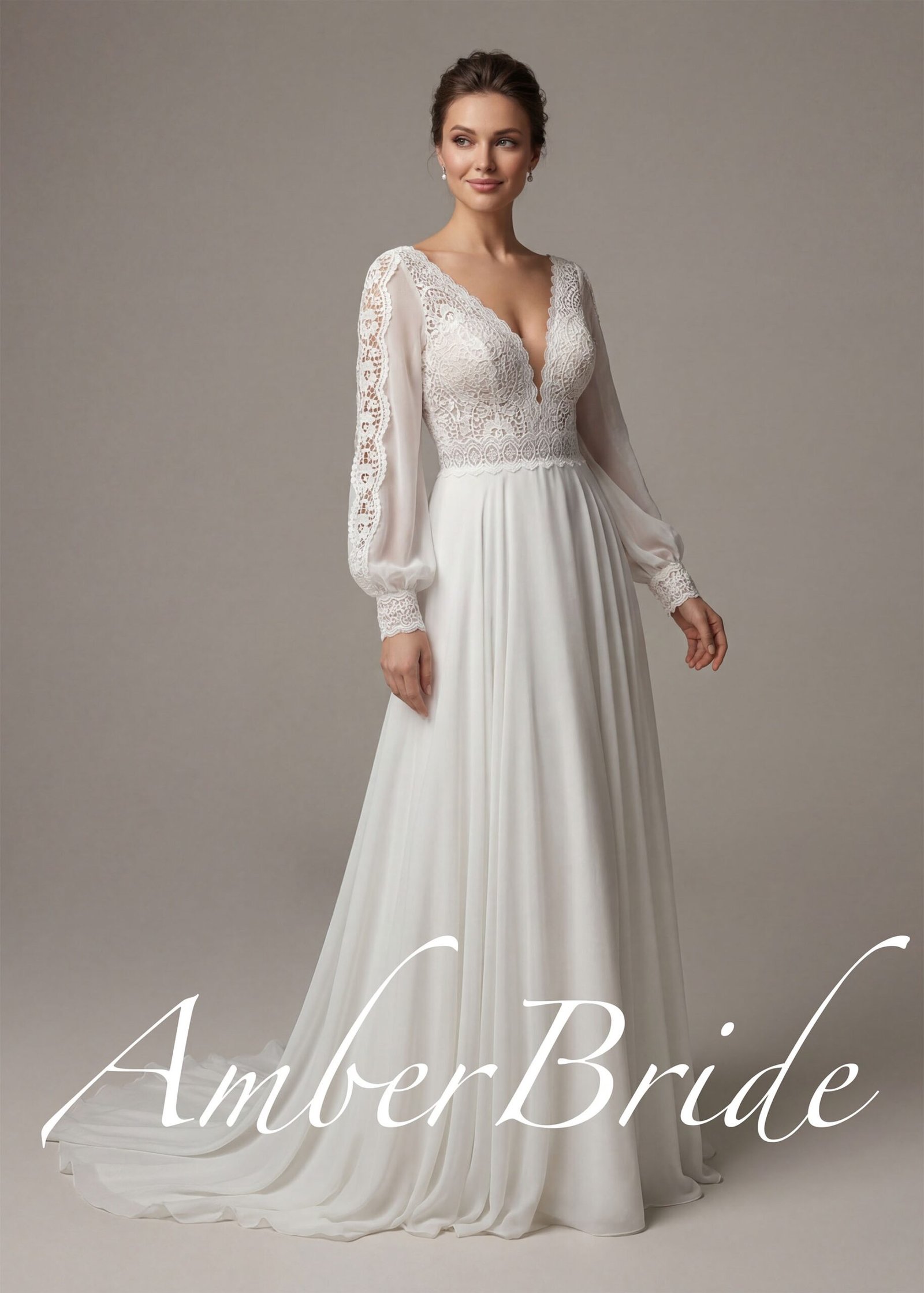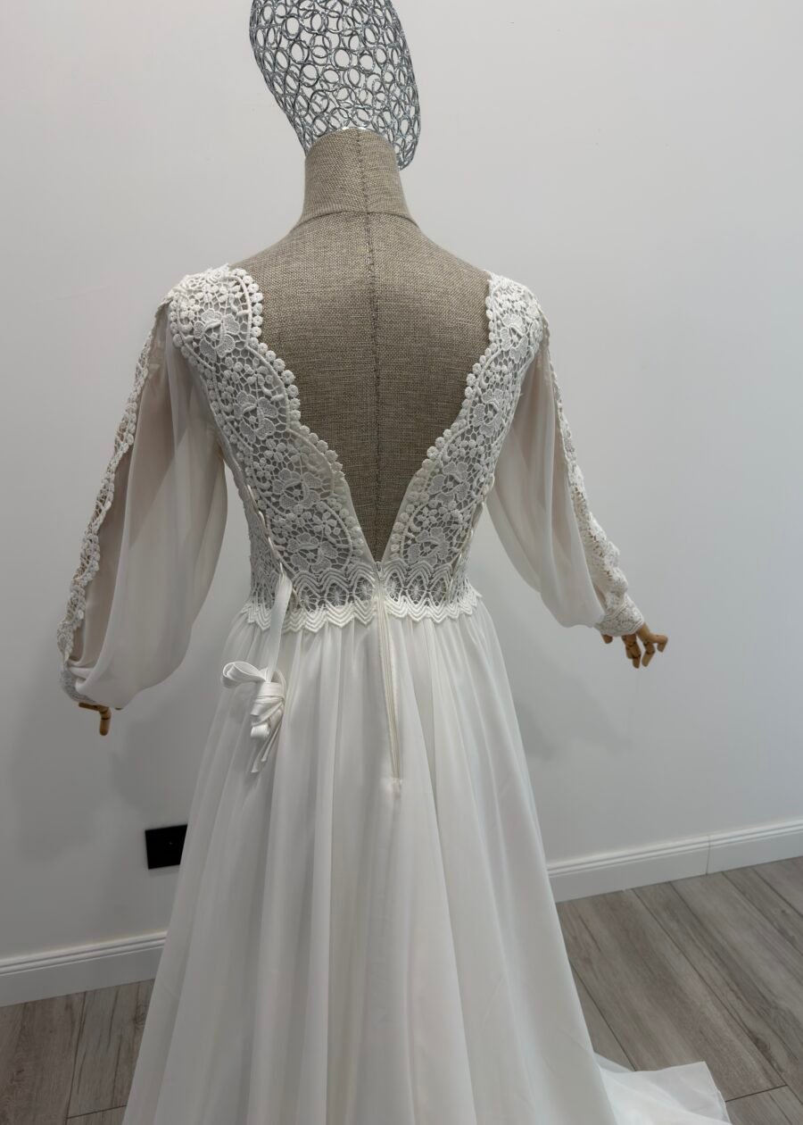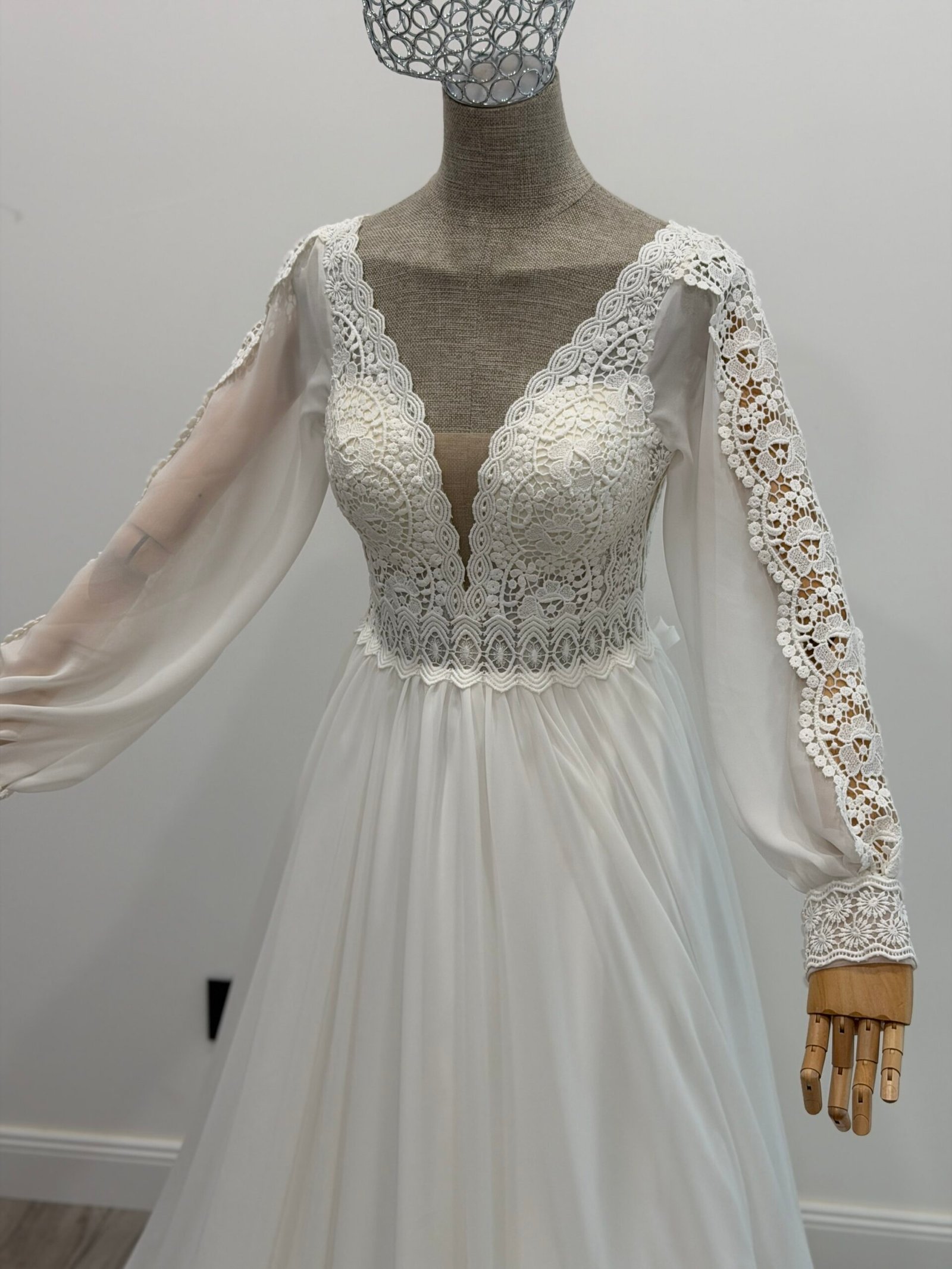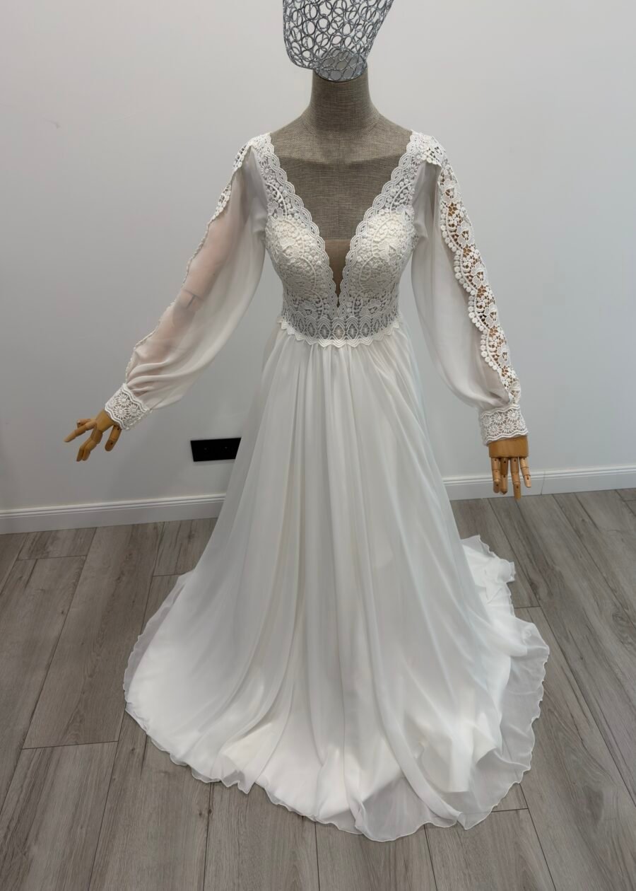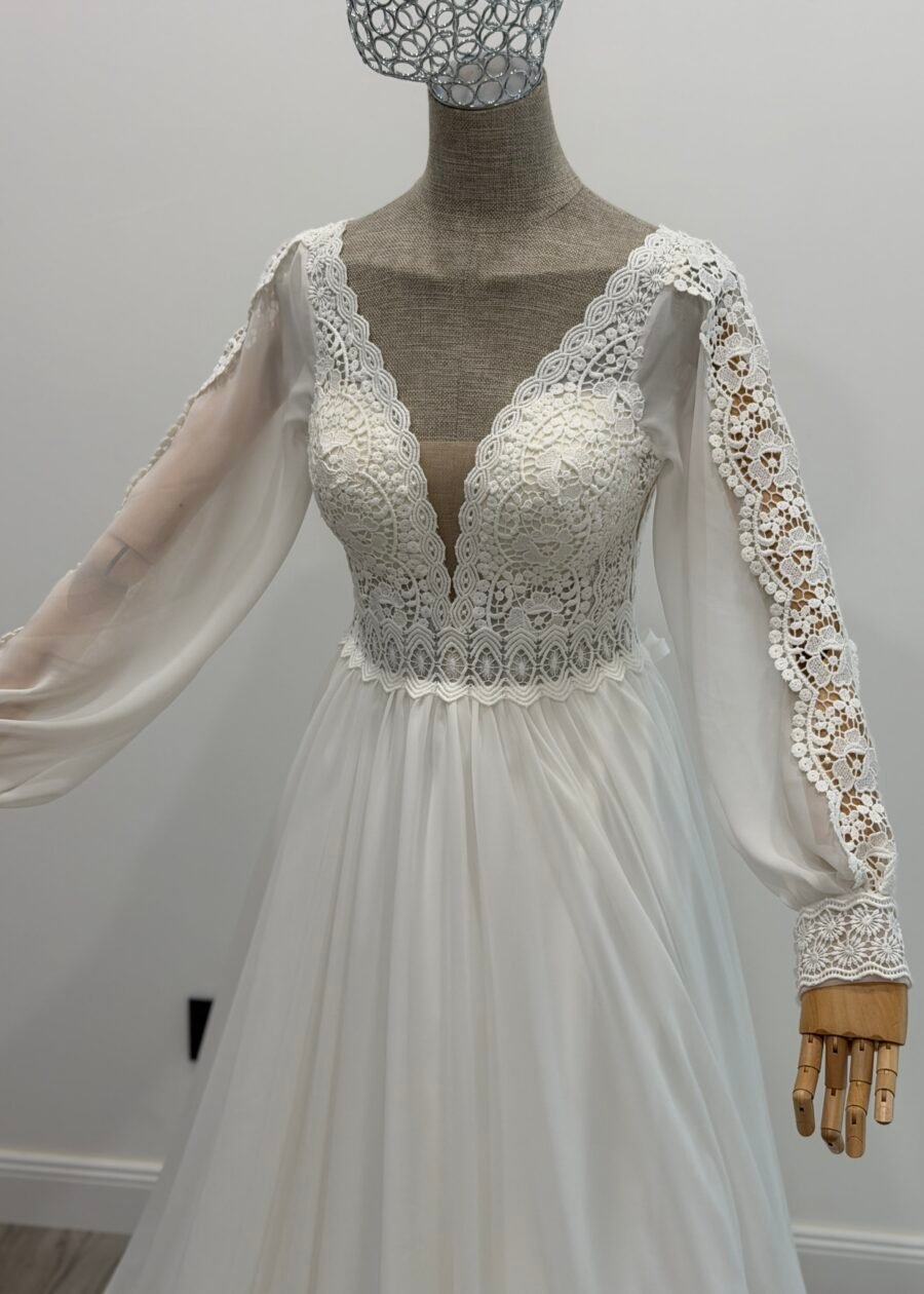 Boho stiliaus vestuvinė suknelė su ilgomis plačiomis rankovėmis