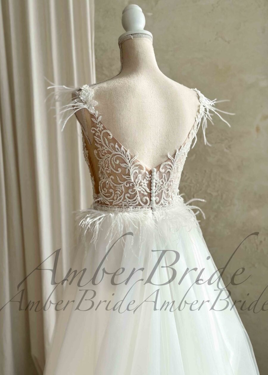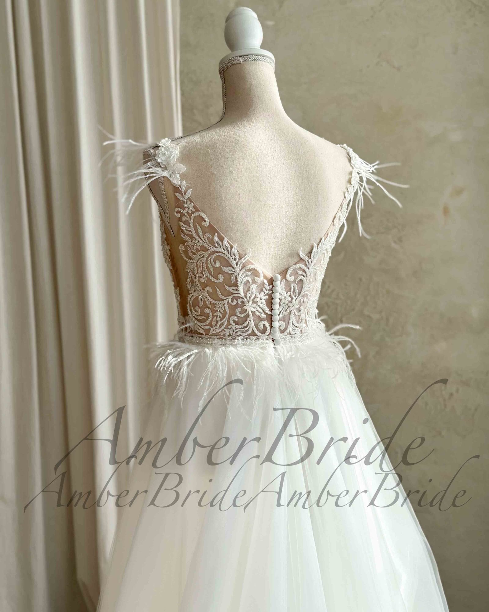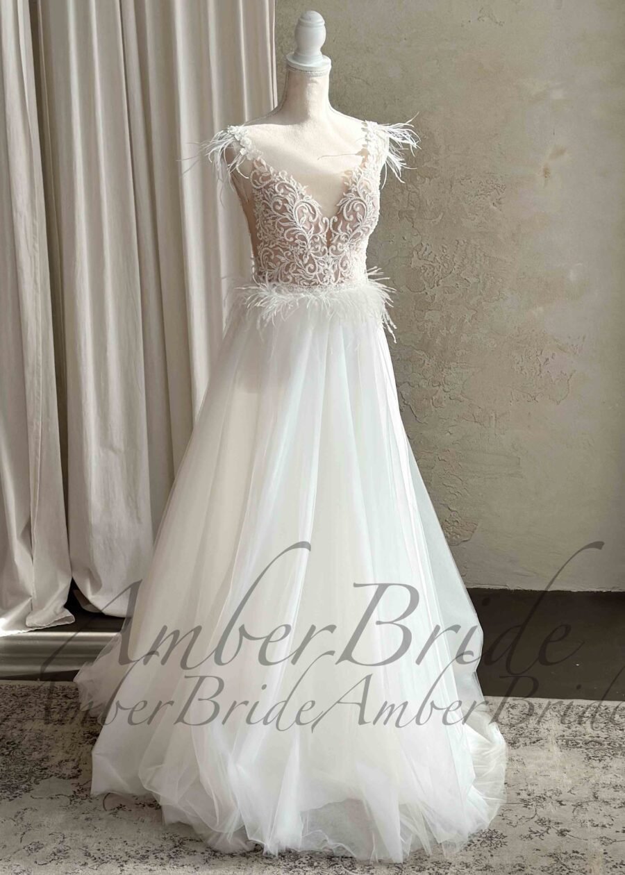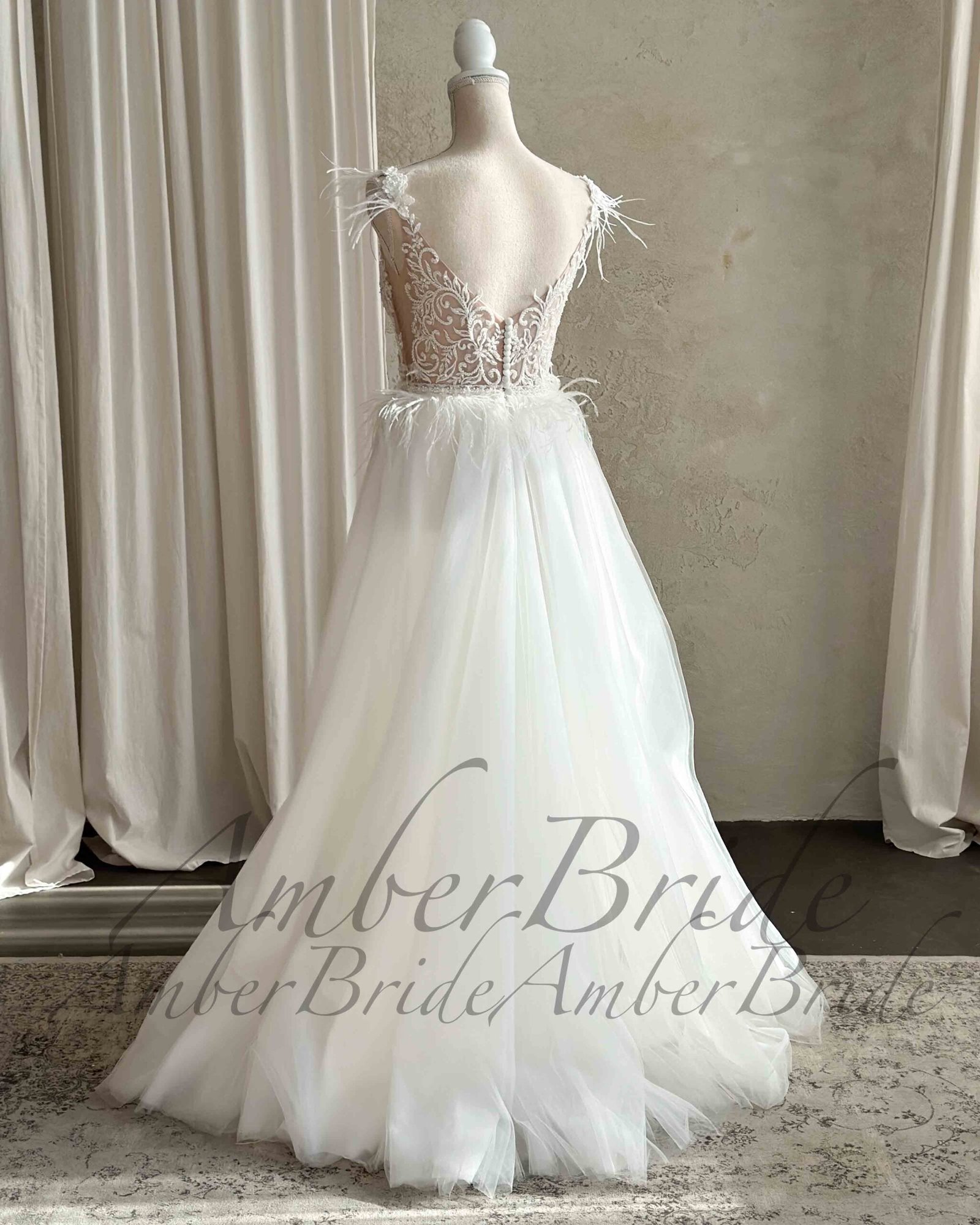 Bohemiška vestuvinė suknelė su tulio sijonu ir kutais