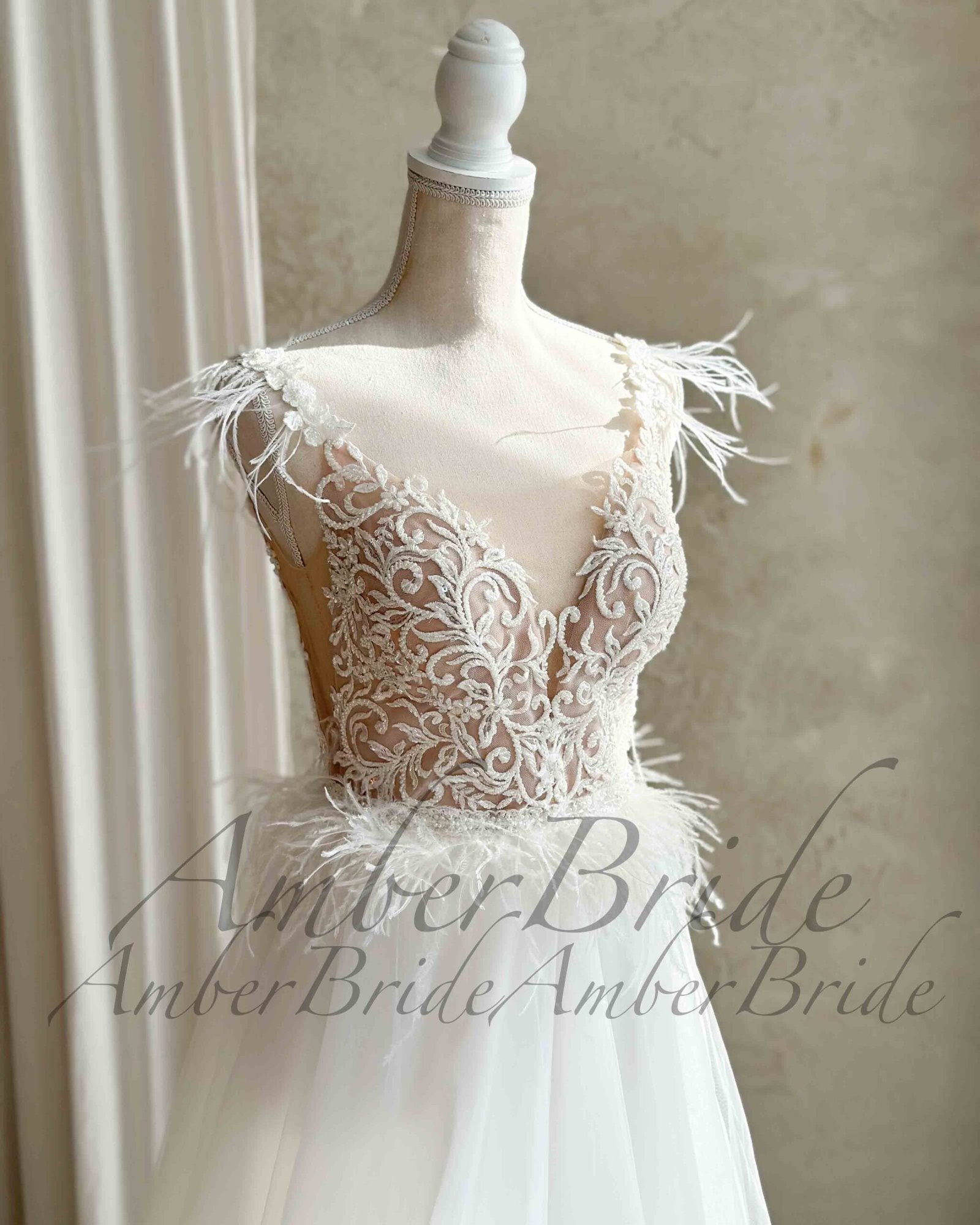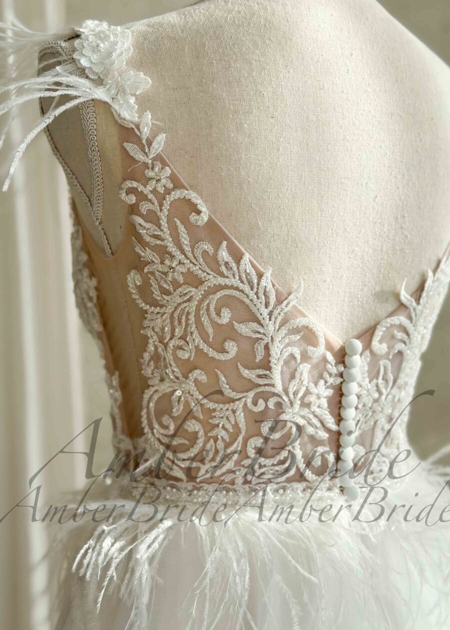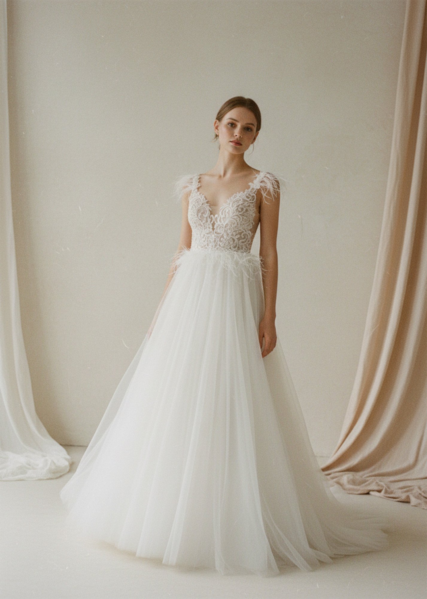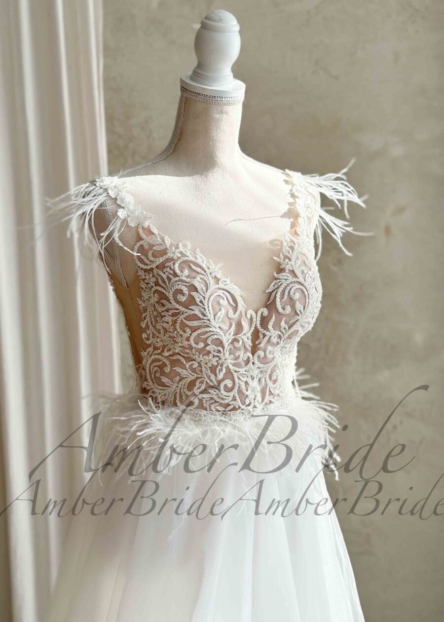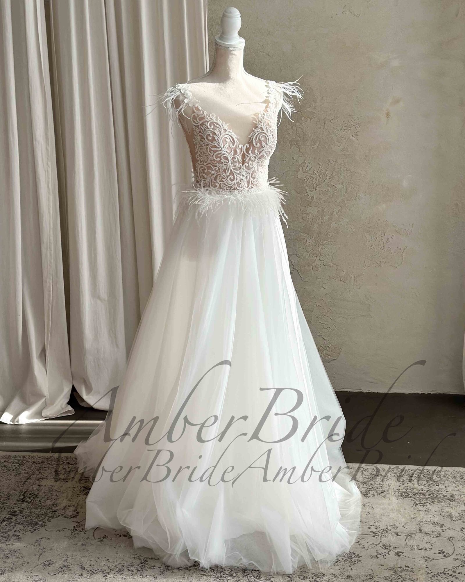Bohemiška vestuvinė suknelė su tulio sijonu ir kutais