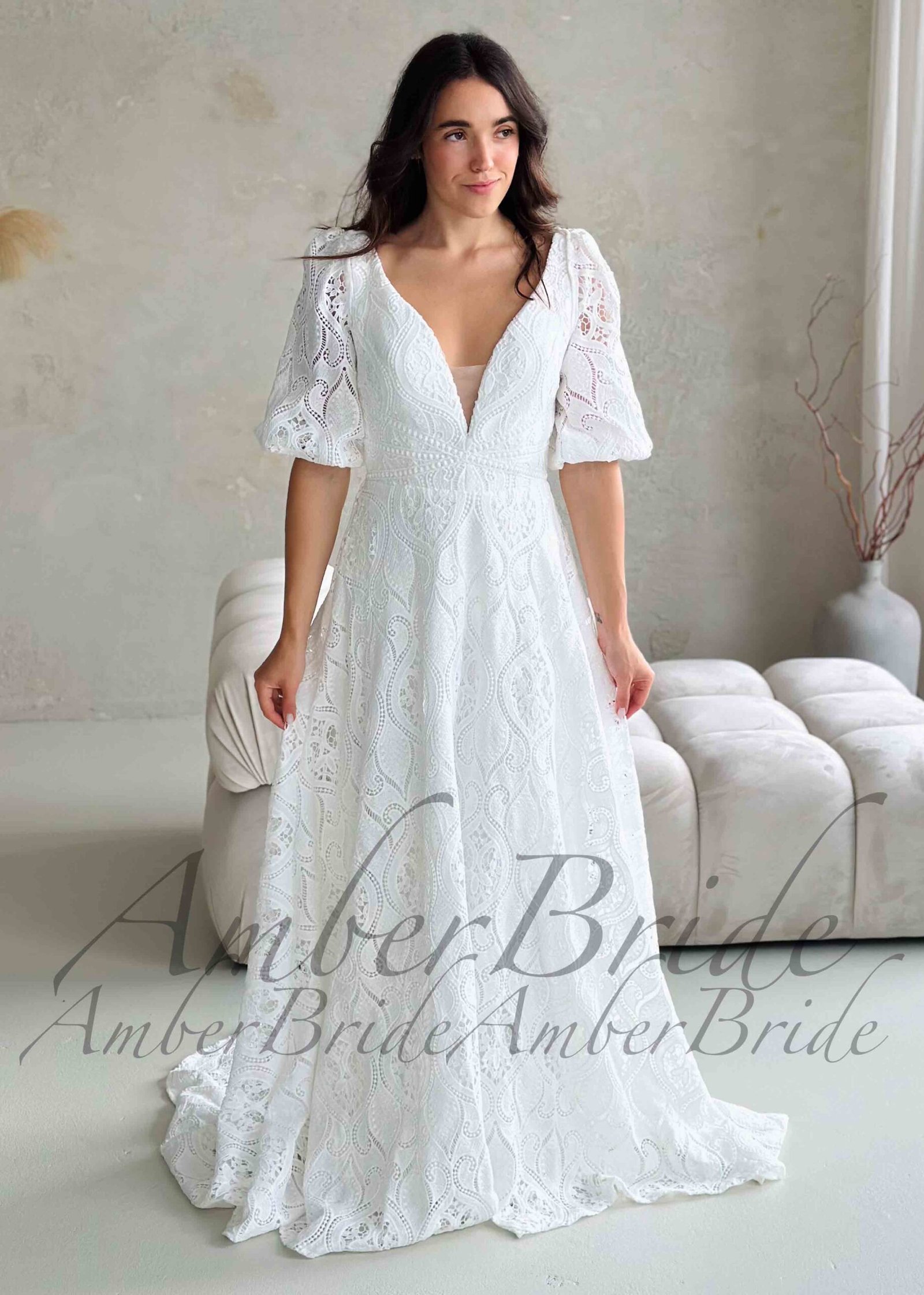 Bohemiška nėriniuota vestuvinė suknelė su aukštu kaklu ir ilgomis rankovėmis