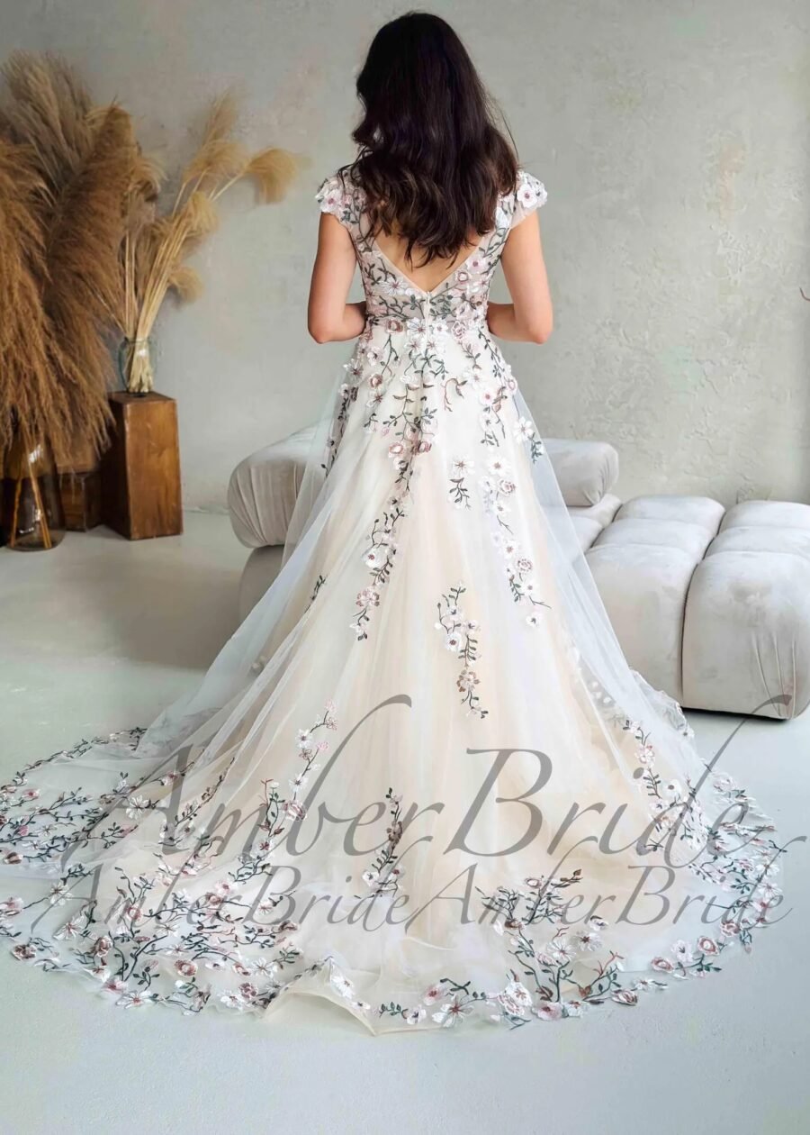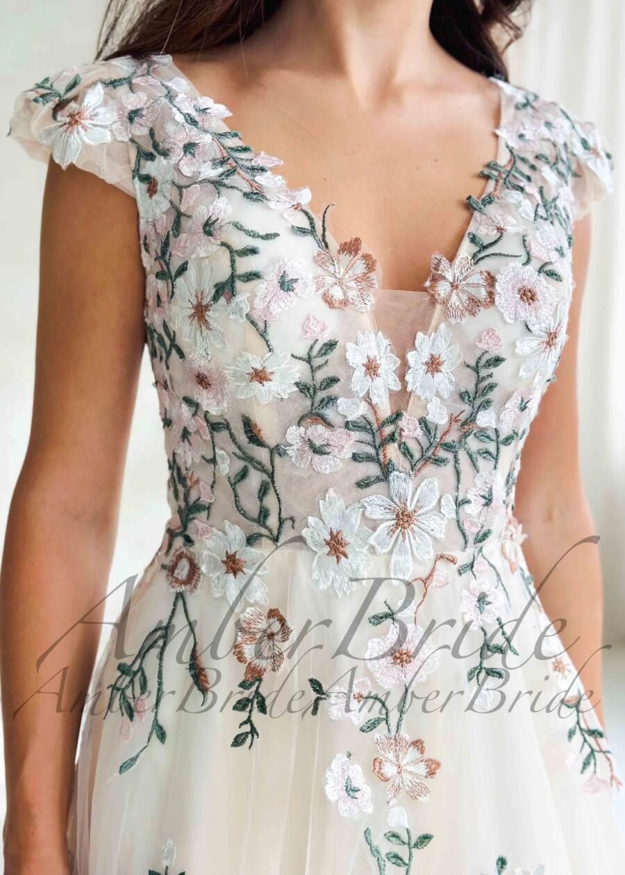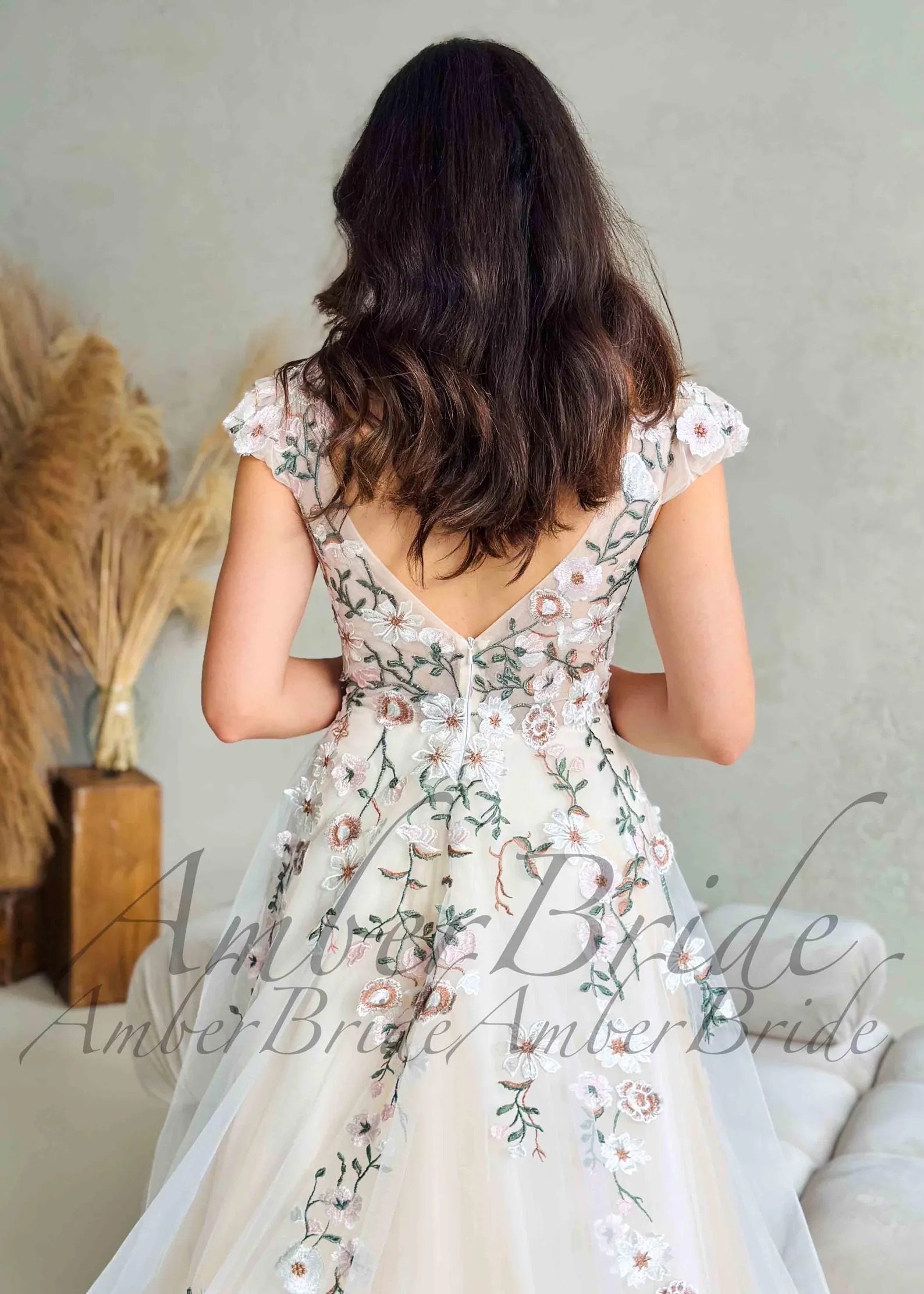 Boho stiliaus tulio vestuvinė suknelė su spalvotomis gėlėmis ir atvira nugara