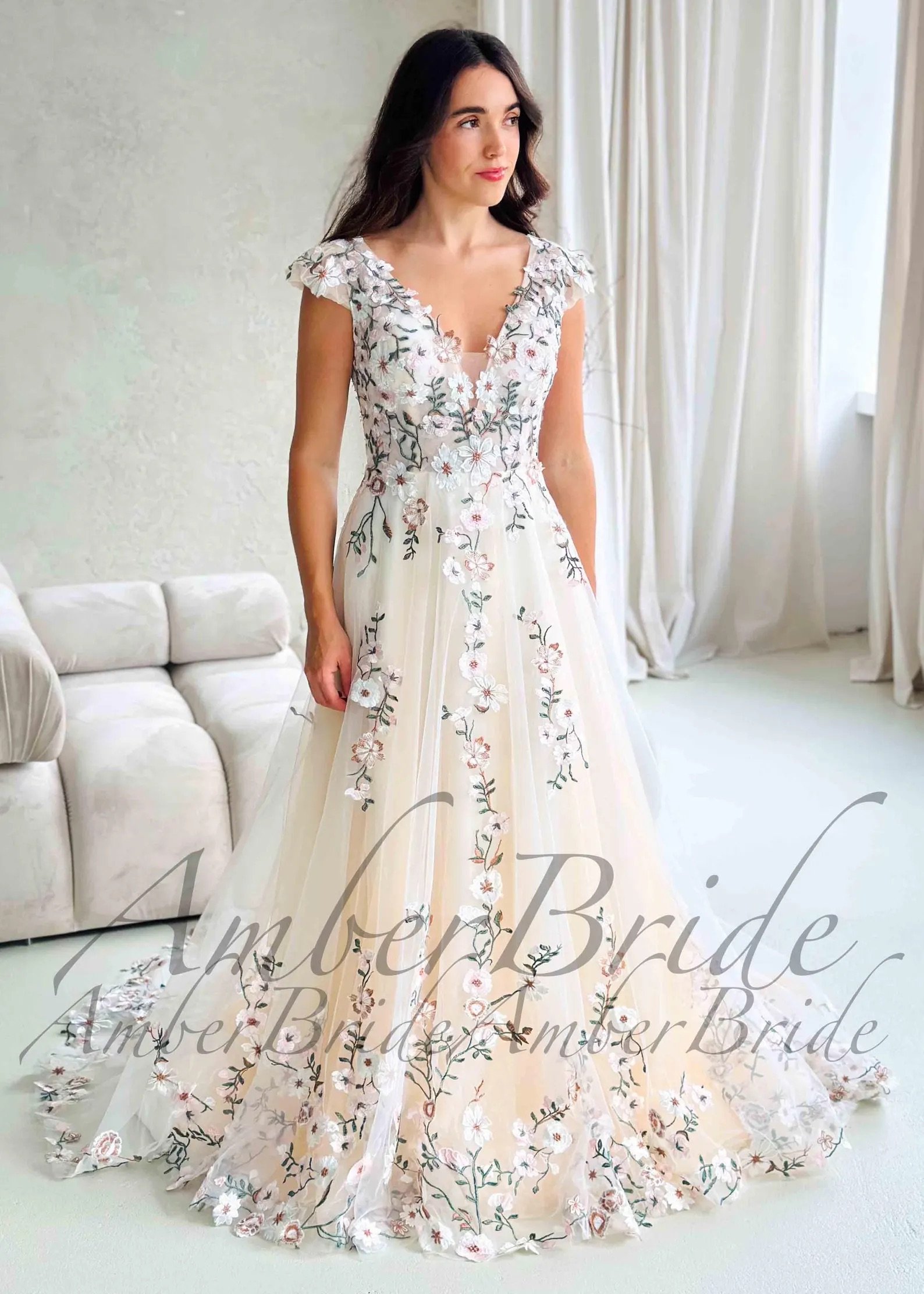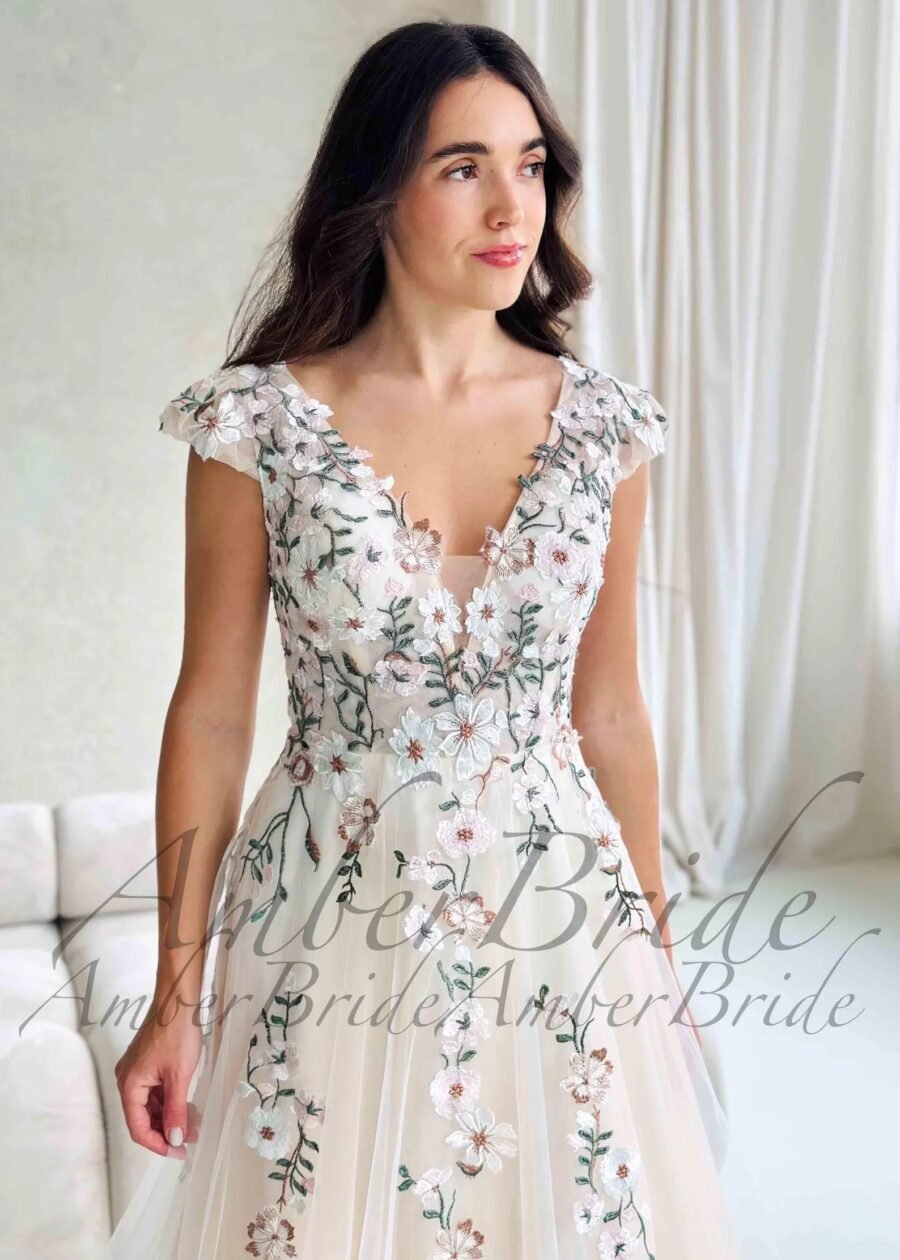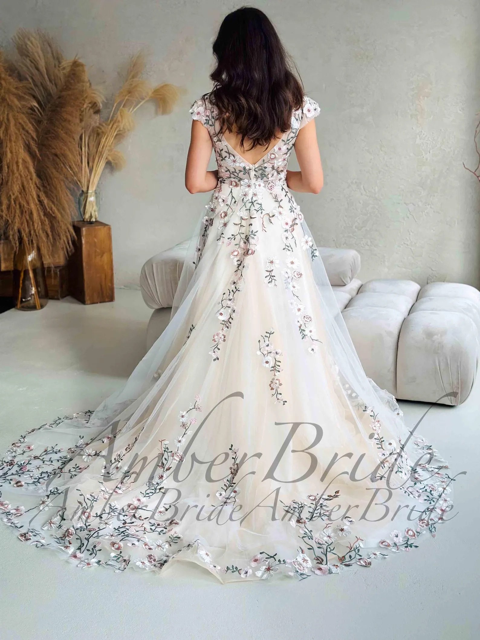 Boho stiliaus tulio vestuvinė suknelė su spalvotomis gėlėmis ir atvira nugara