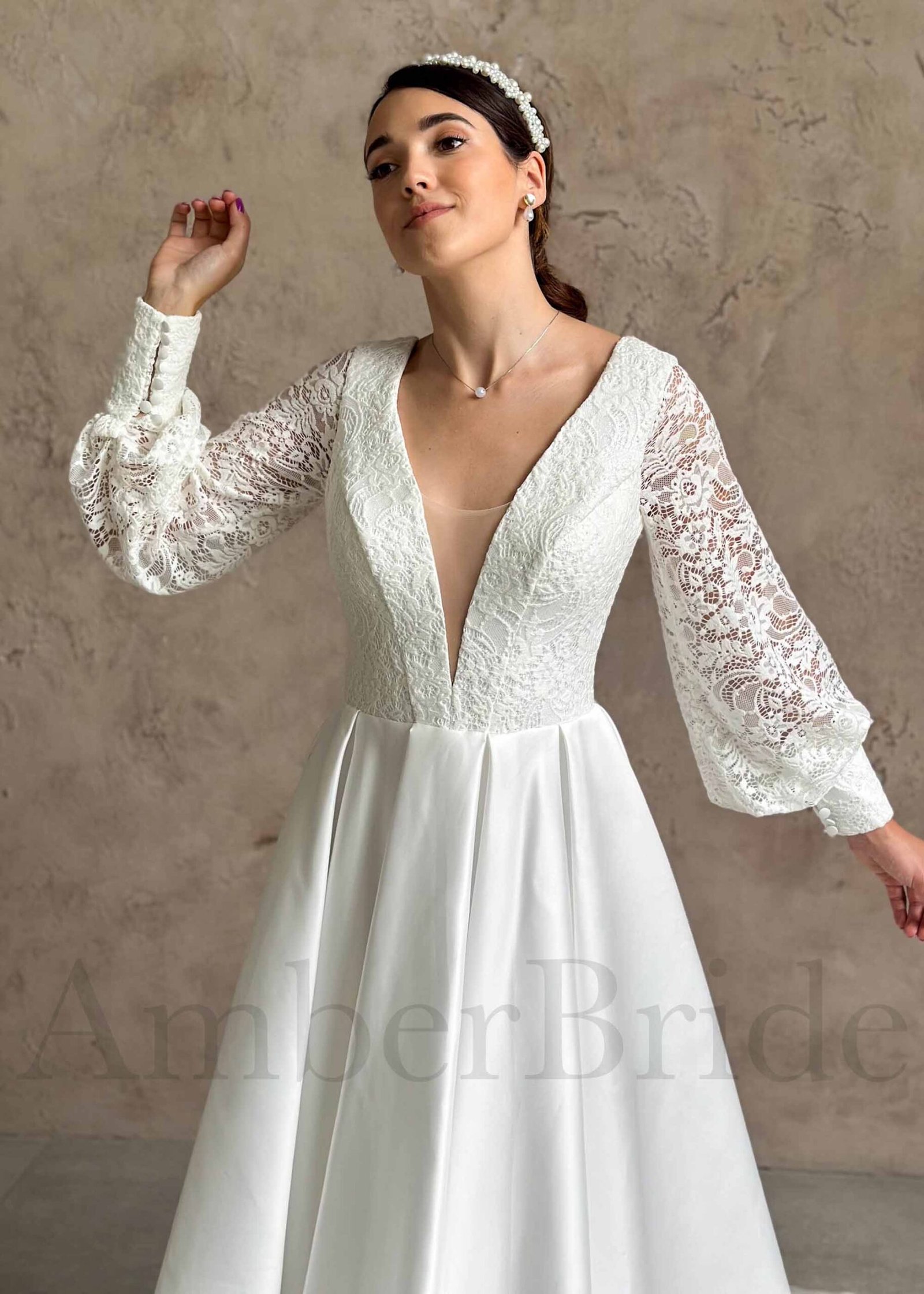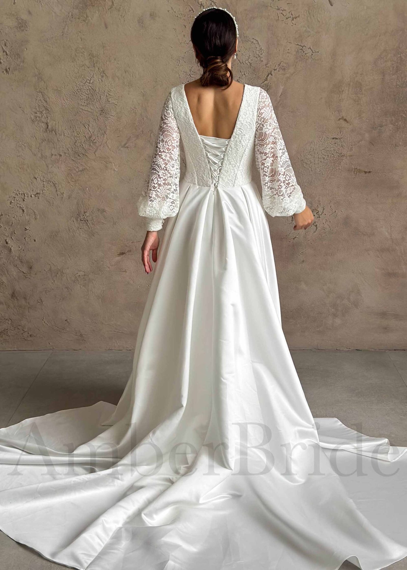 Boho stiliaus vestuvinė suknelė su ilgomis nėriniuotomis rankovėmis ir satino sijonu