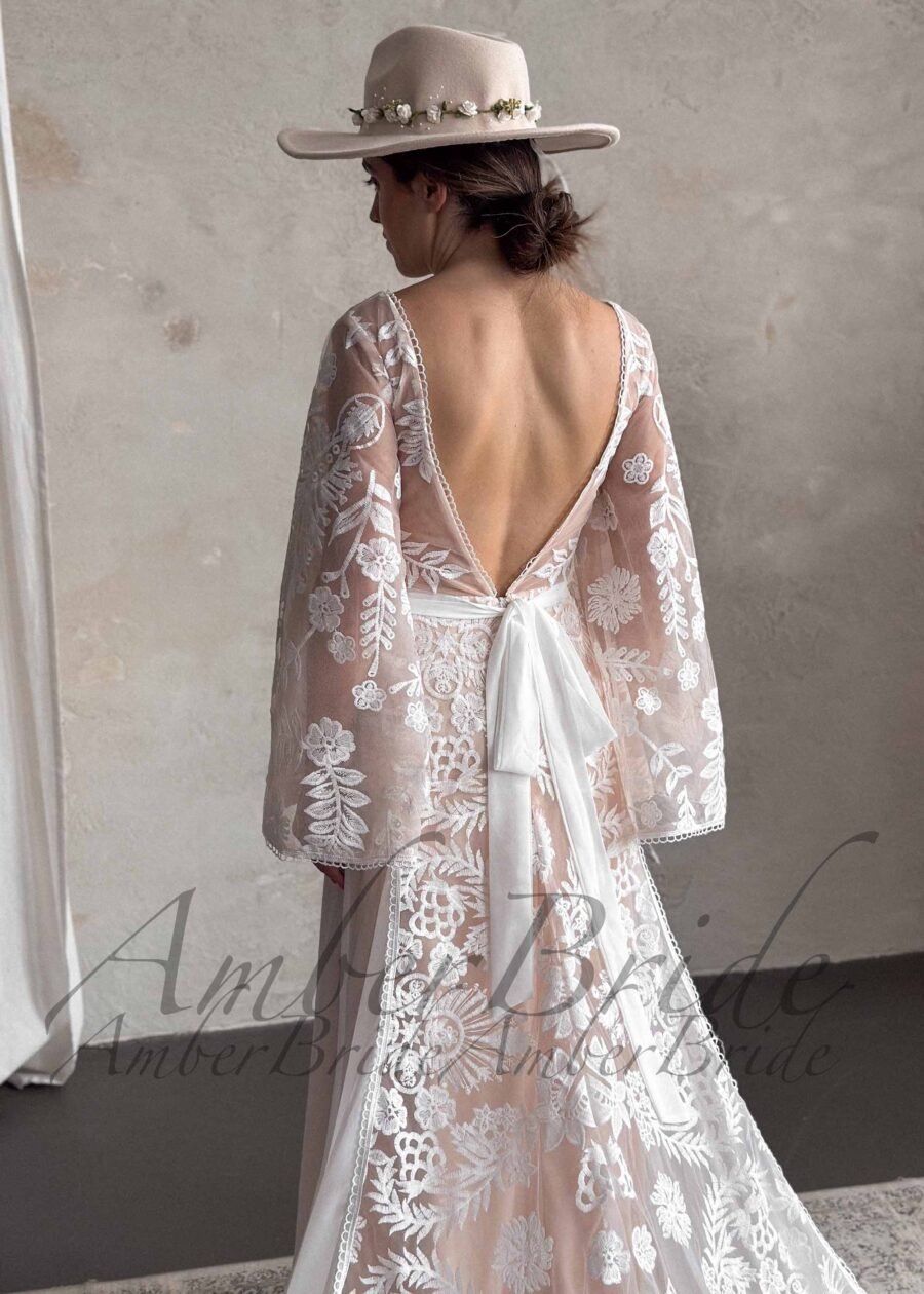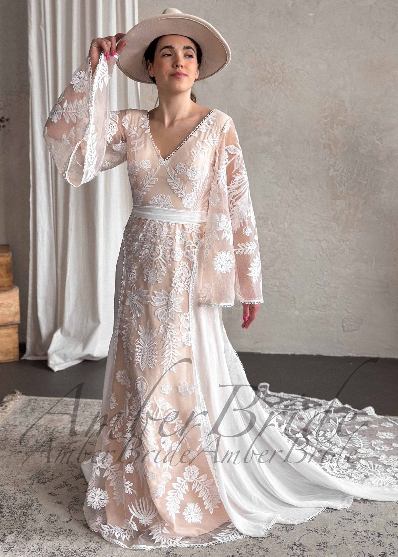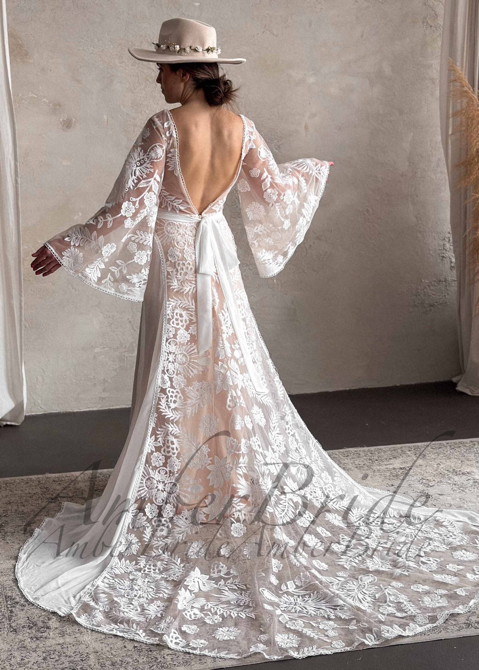 Boho stiliaus vestuvinė suknelė su ilgomis plačiomis rankovėmis