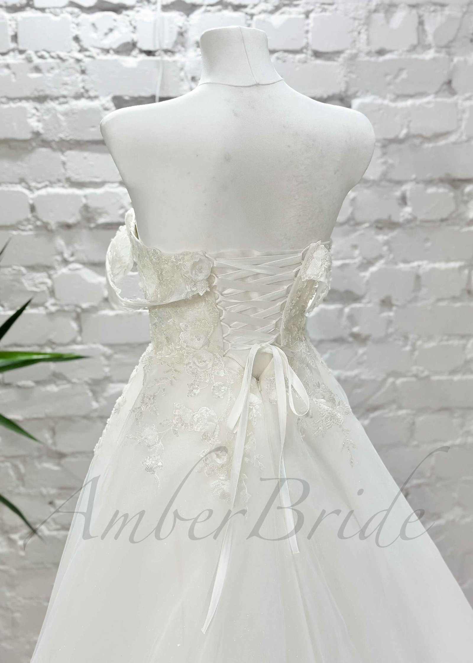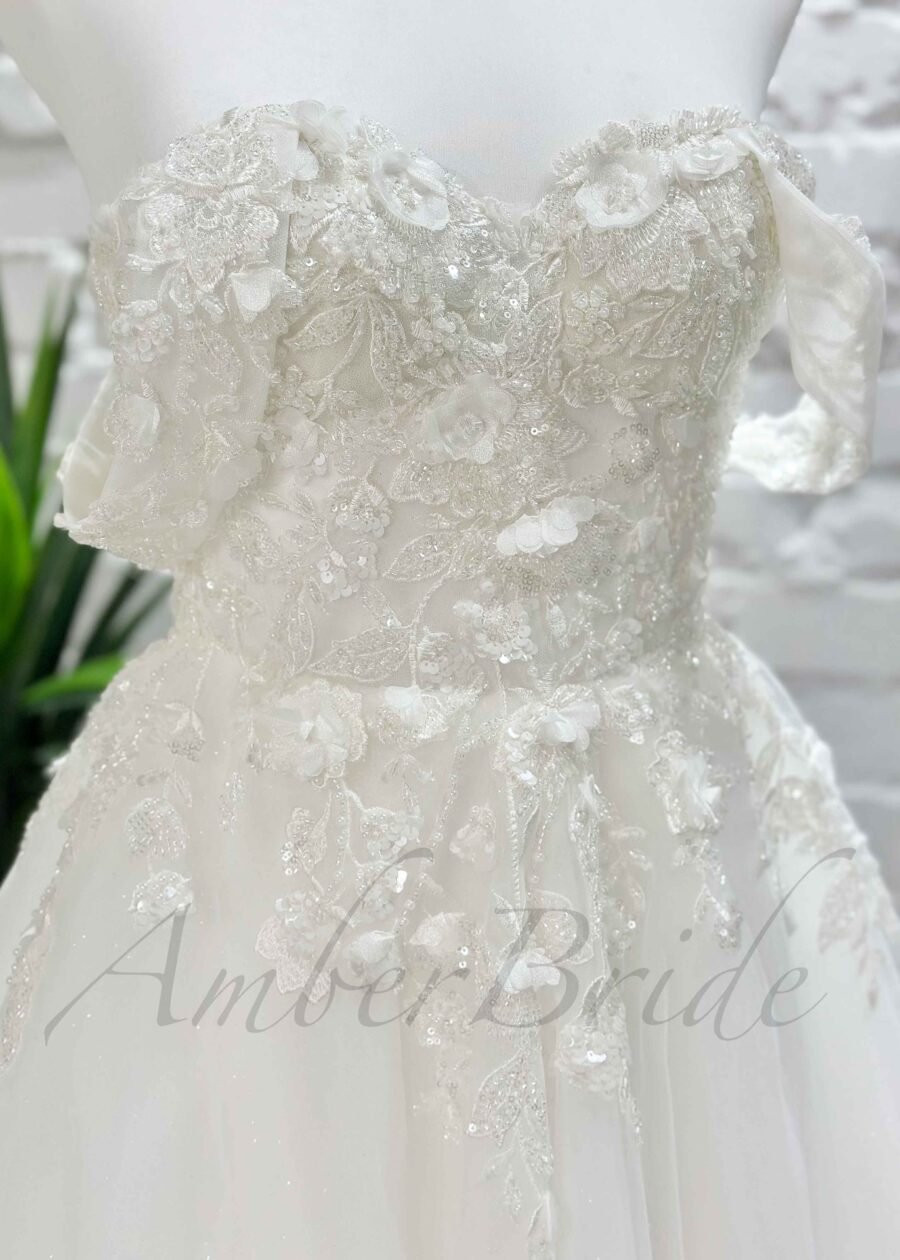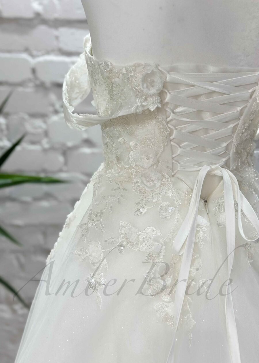 Gėlėta tulio vestuvinė suknelė su atvirais pečiais ir korsetu