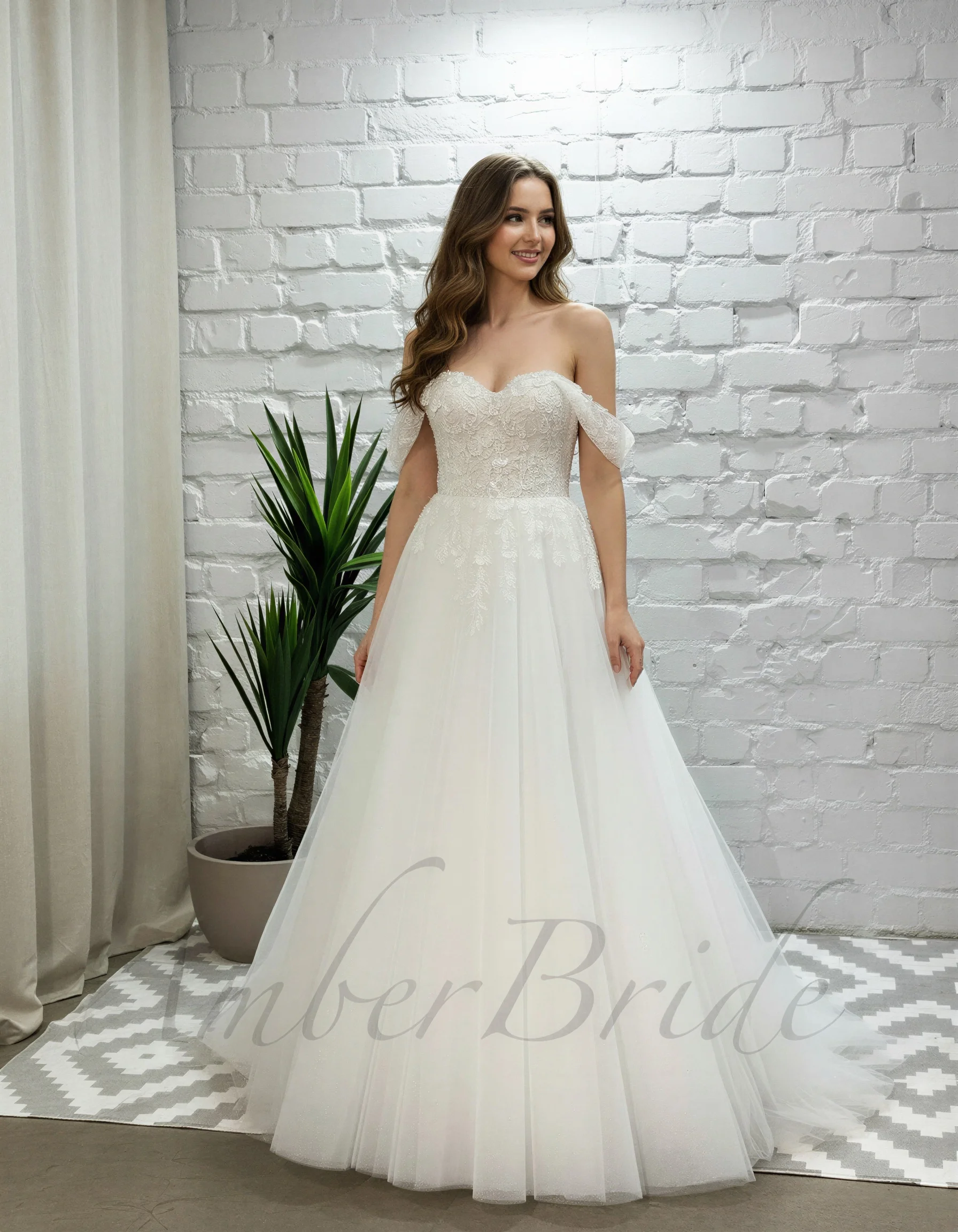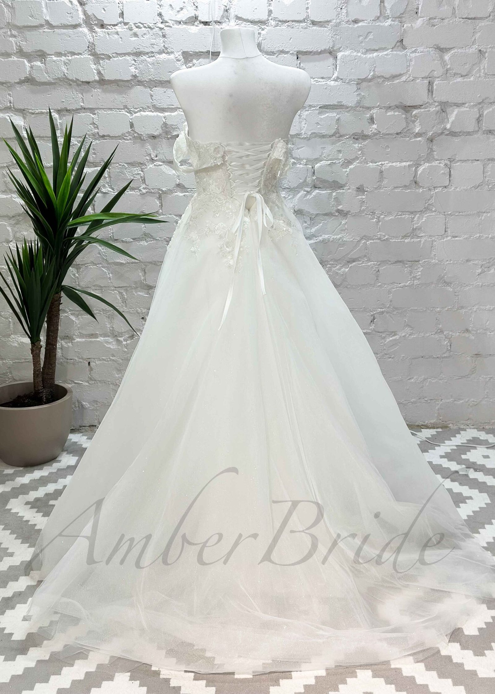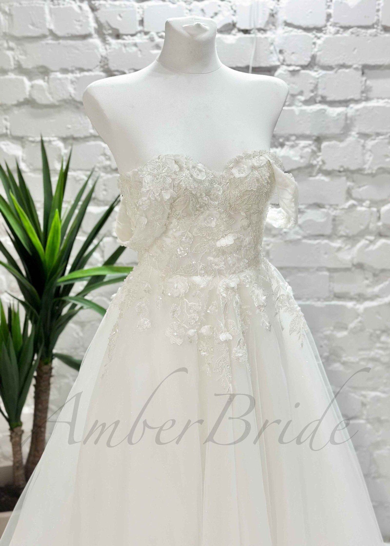 Gėlėta tulio vestuvinė suknelė su atvirais pečiais ir korsetu