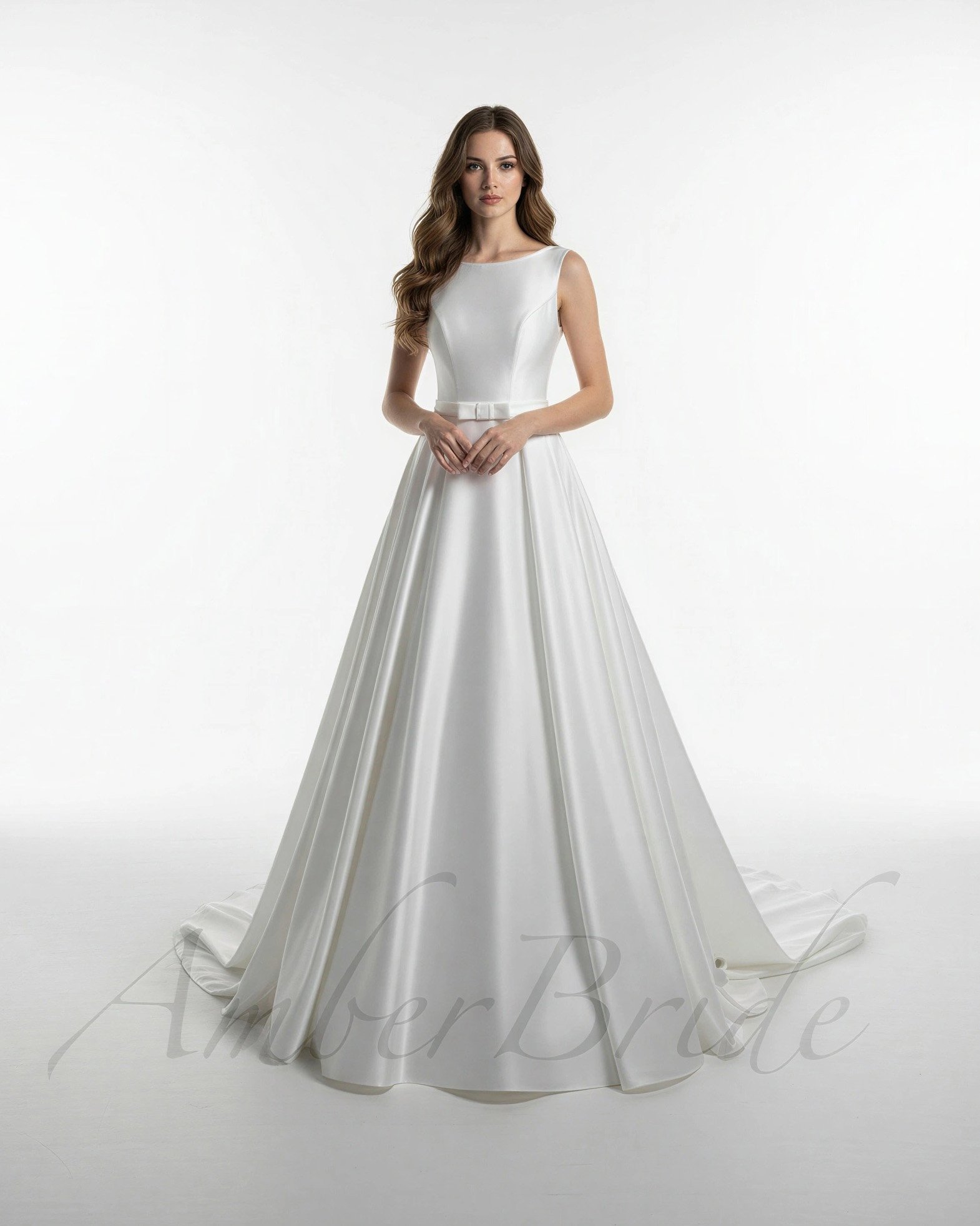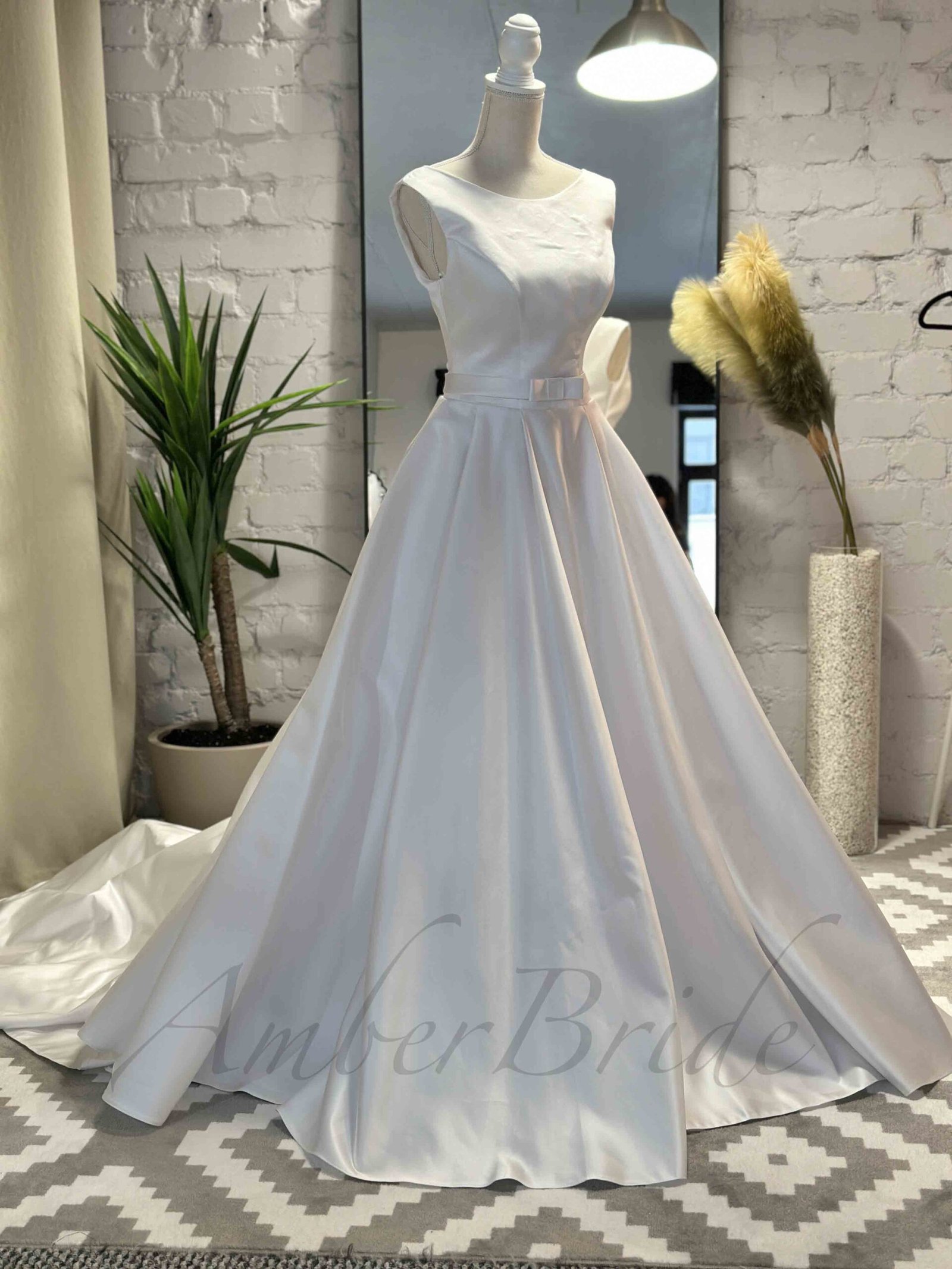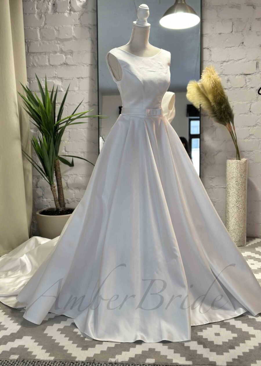 Minimalistinė satino vestuvinė suknelė su ilgu šleifu