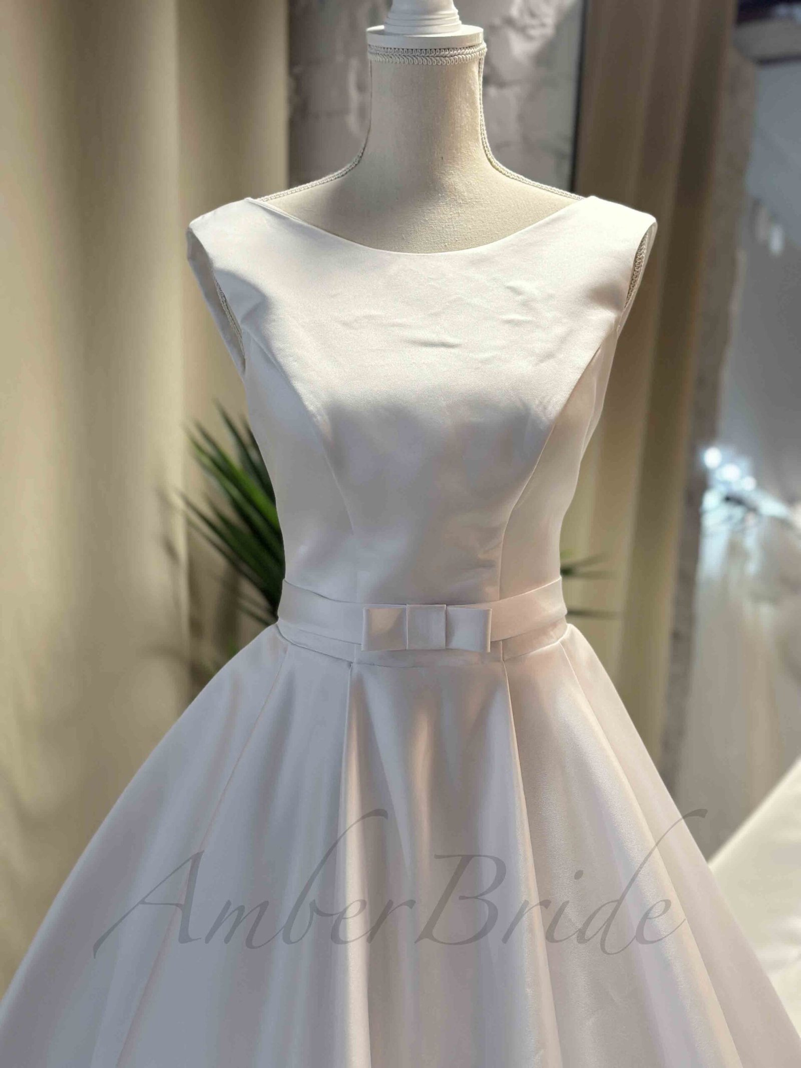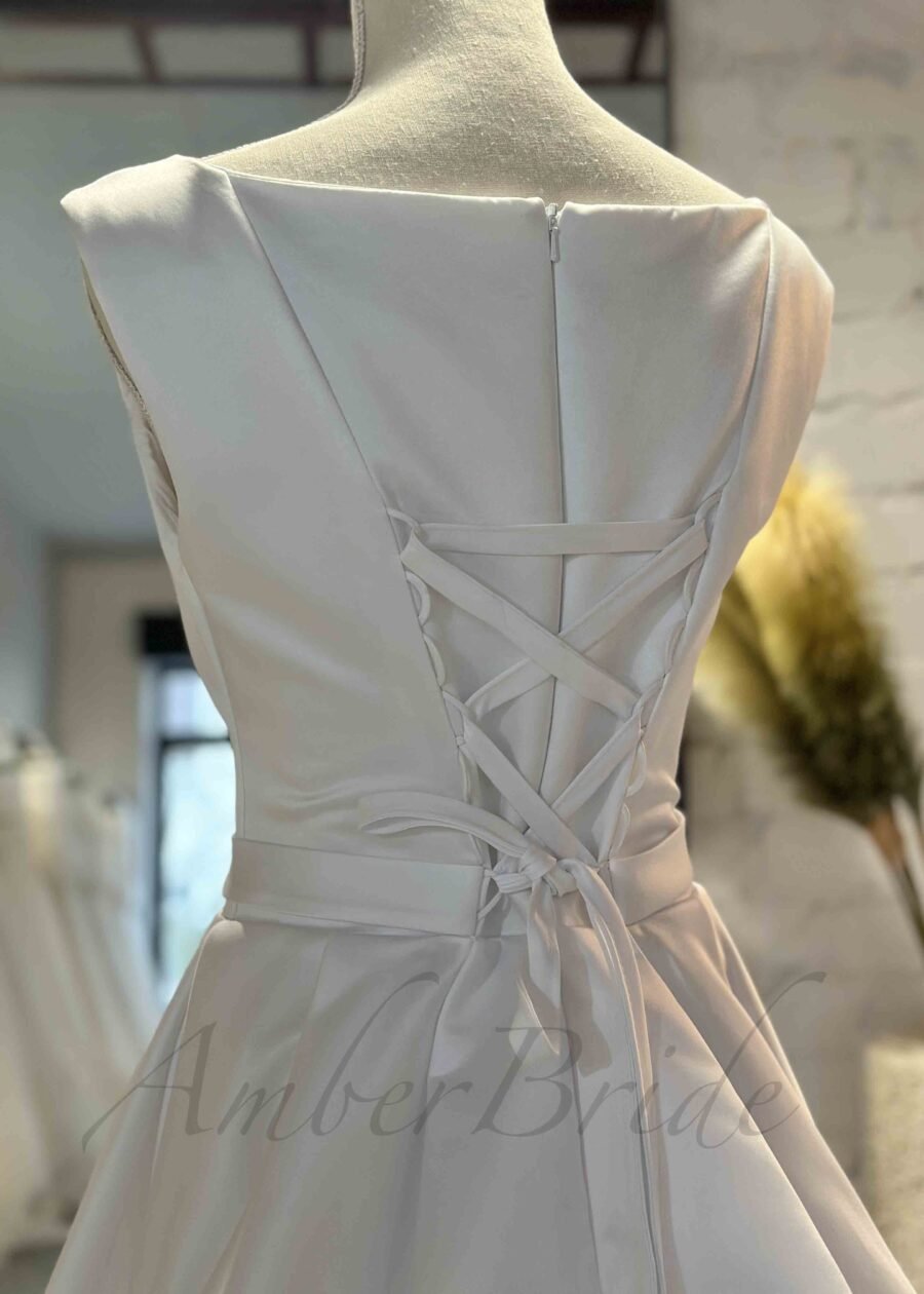 Moderni vestuvinė suknelė iš satino su V formos liemeniu