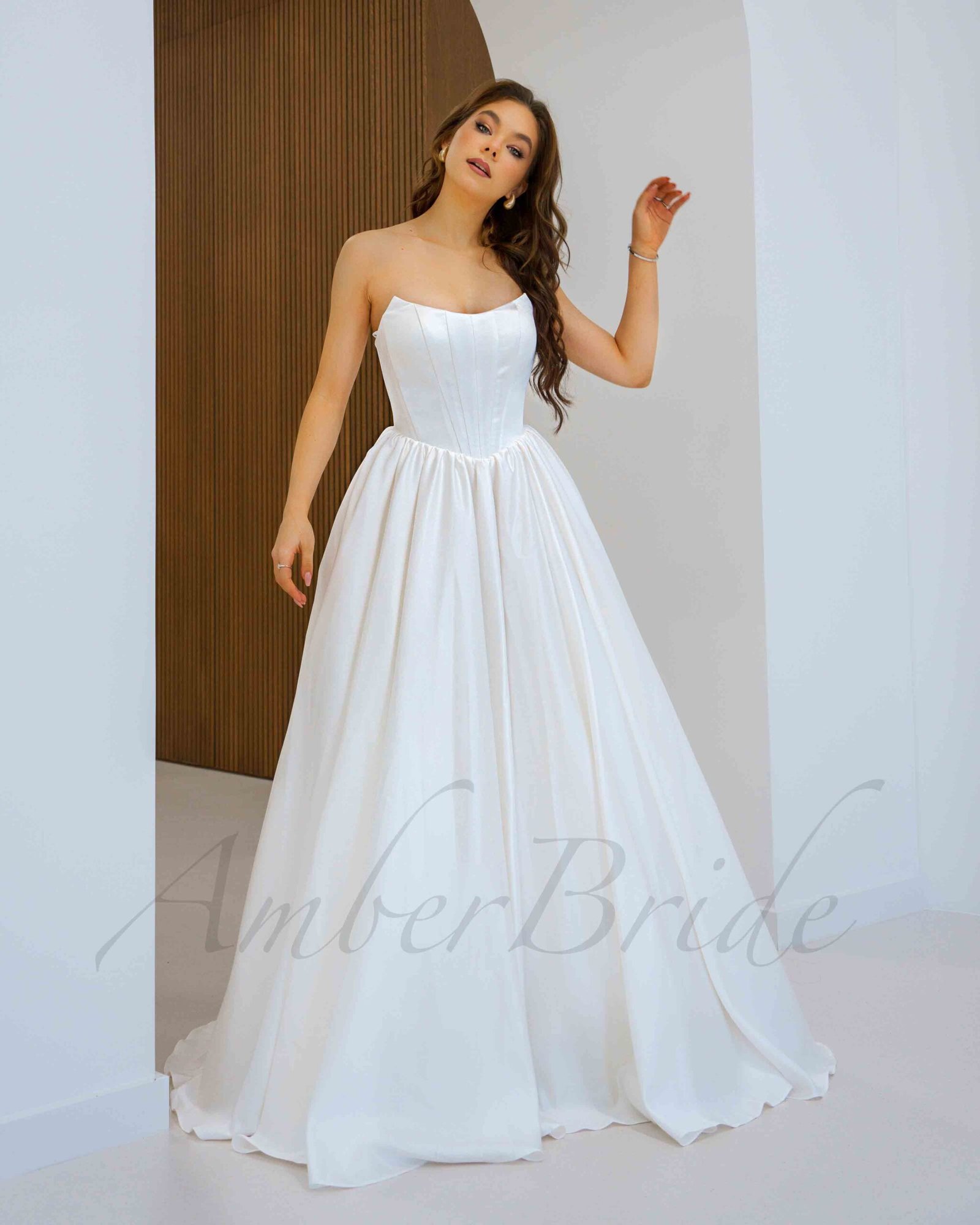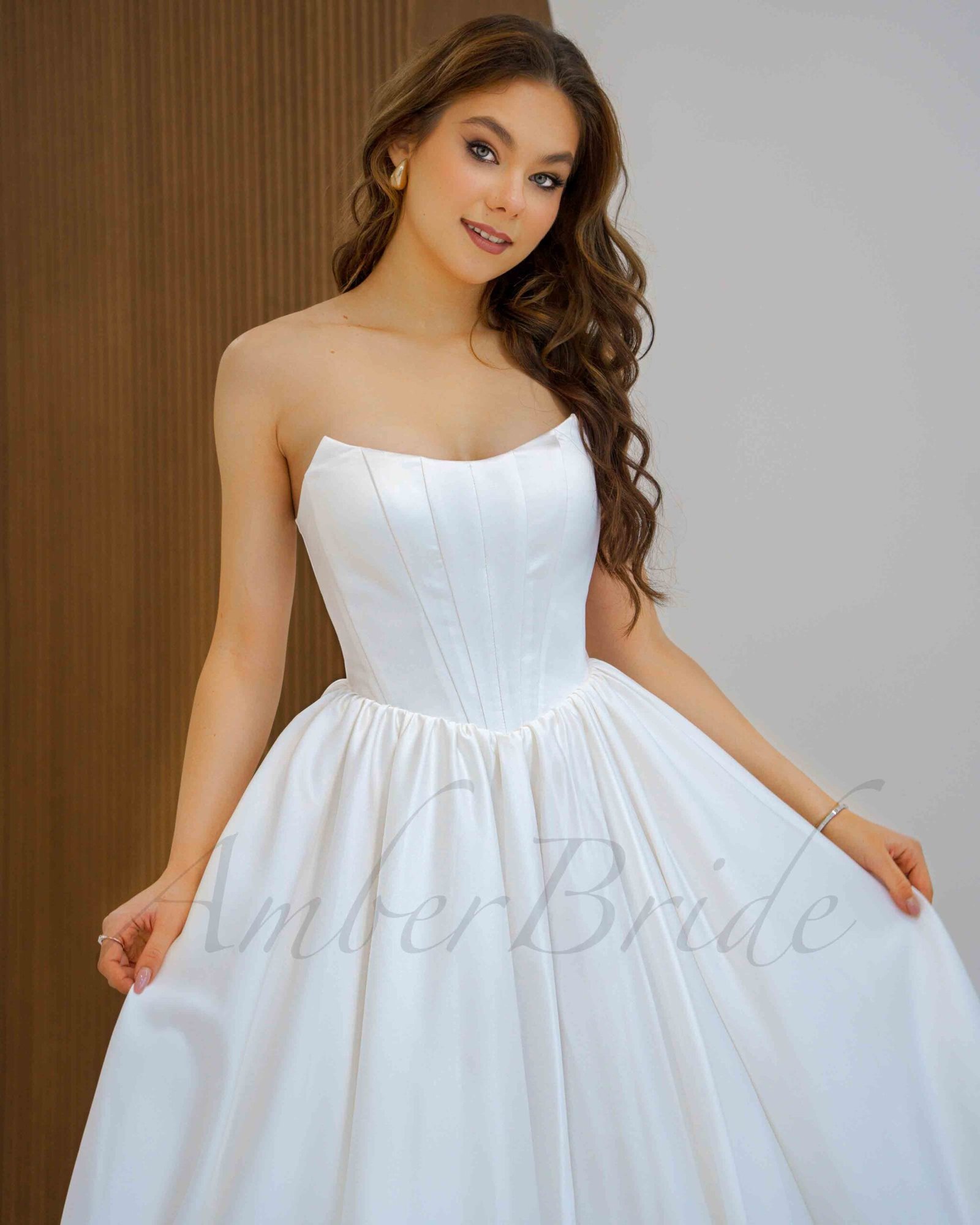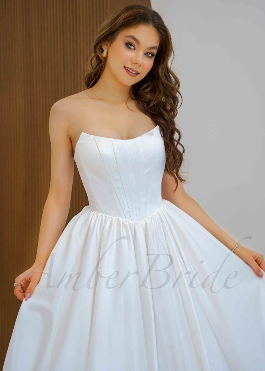 Moderni vestuvinė suknelė iš satino su V formos liemeniu