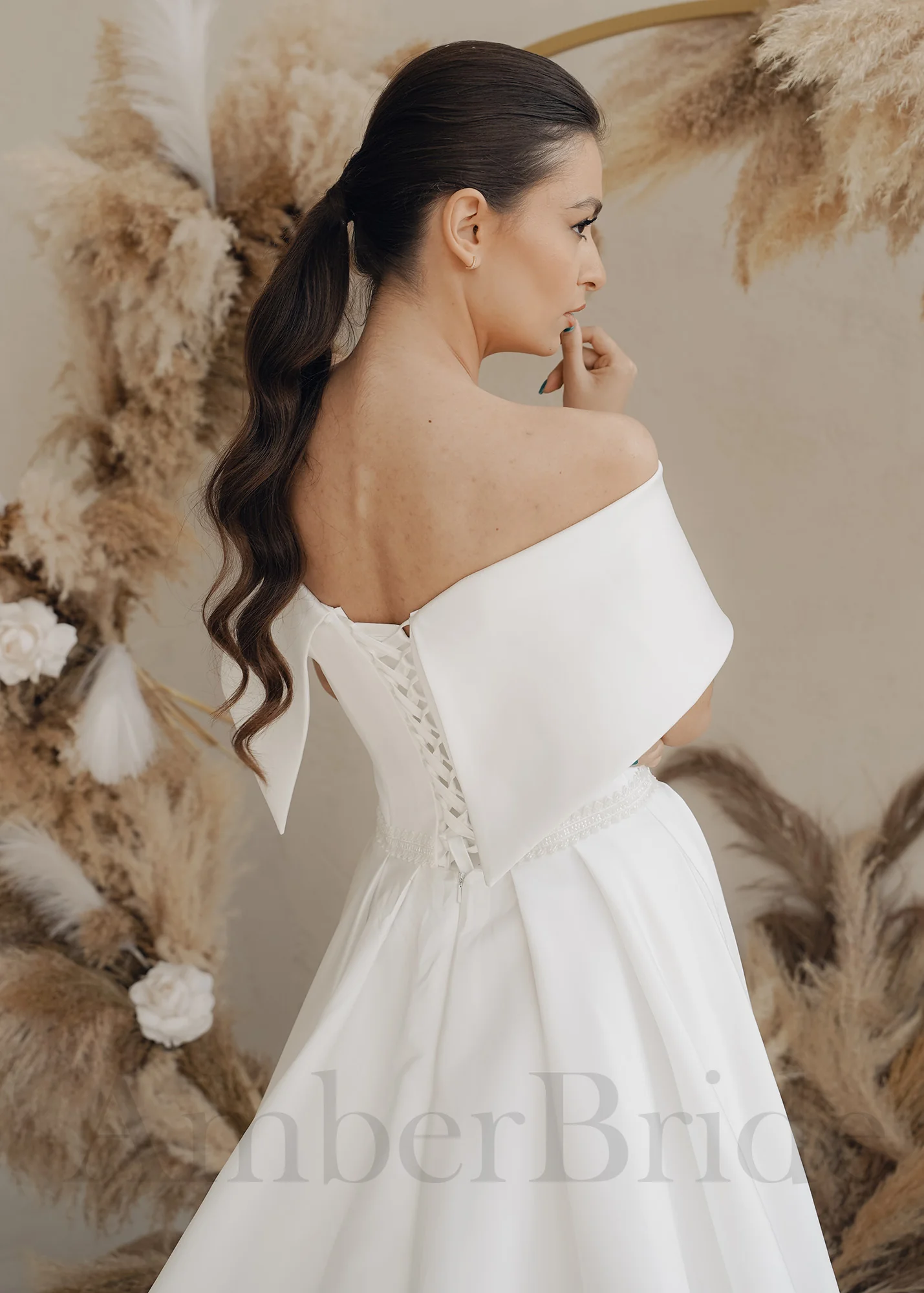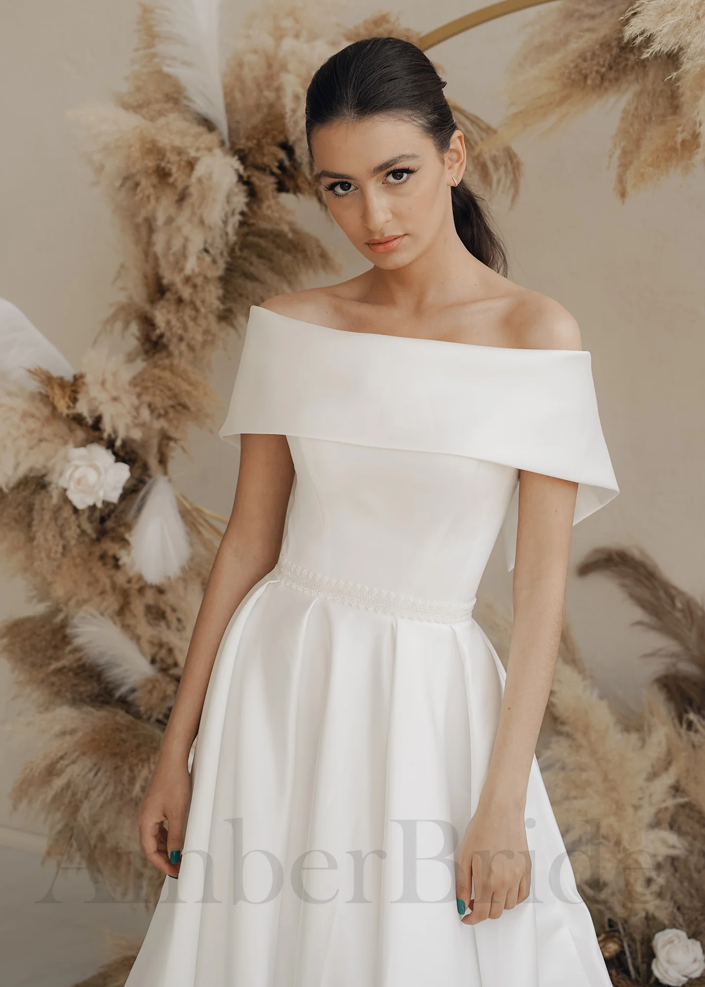 Klasikinė satino vestuvinė suknelė atvirais pečiais
