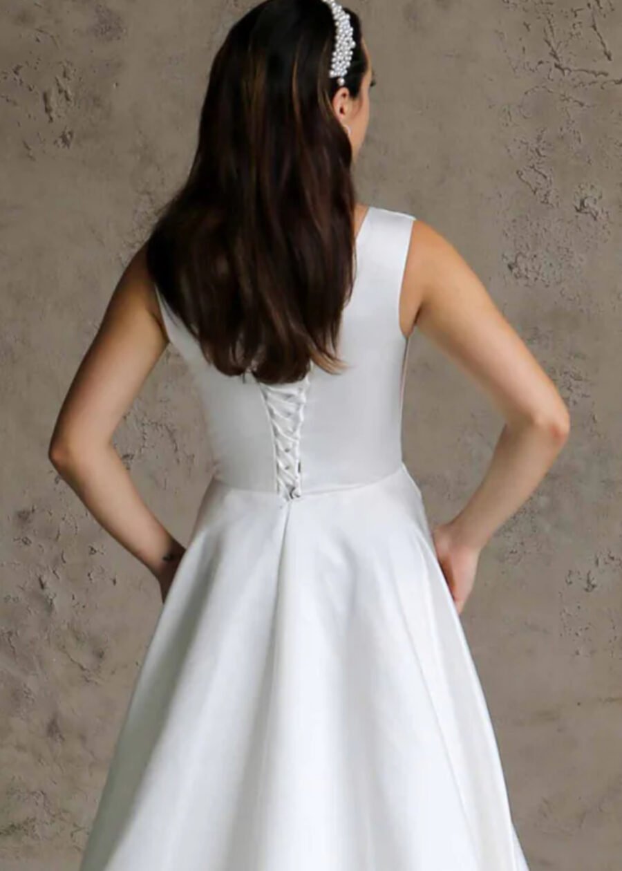 Klasikinė satino vestuvinė suknelė giliu kaklu (be šleifo, su užtrauktuku)