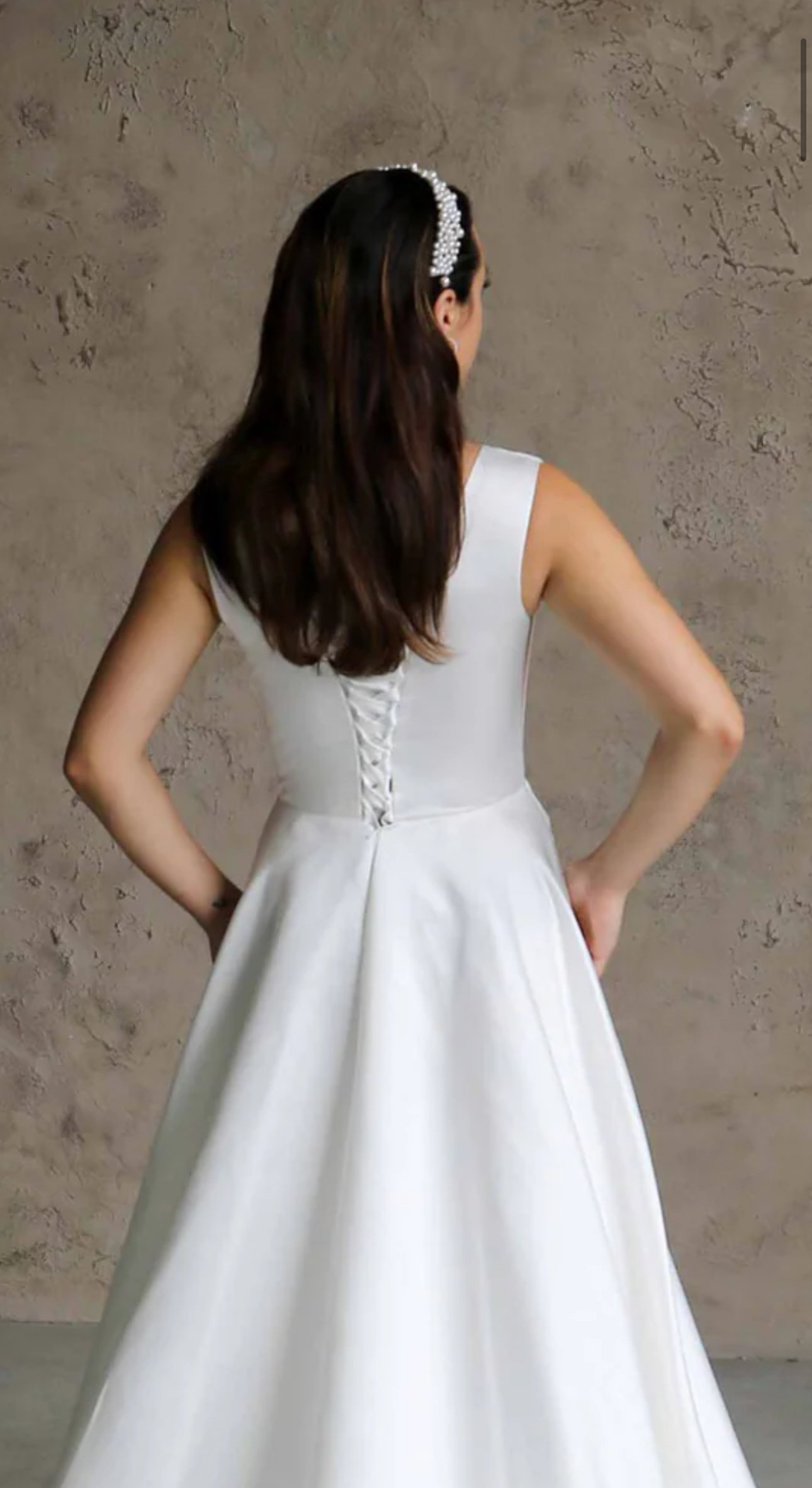 Minimalistinė satino vestuvinė suknelė su ilgu šleifu