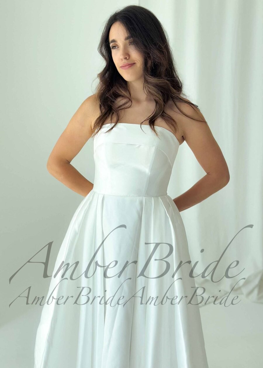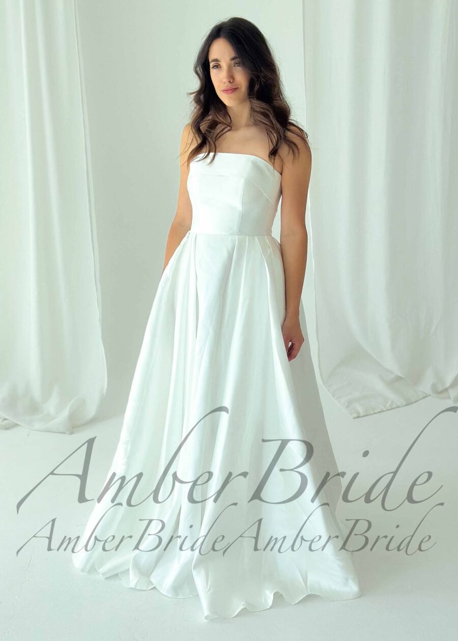 Minimalistinė satino vestuvinė suknelė su ilgu šleifu