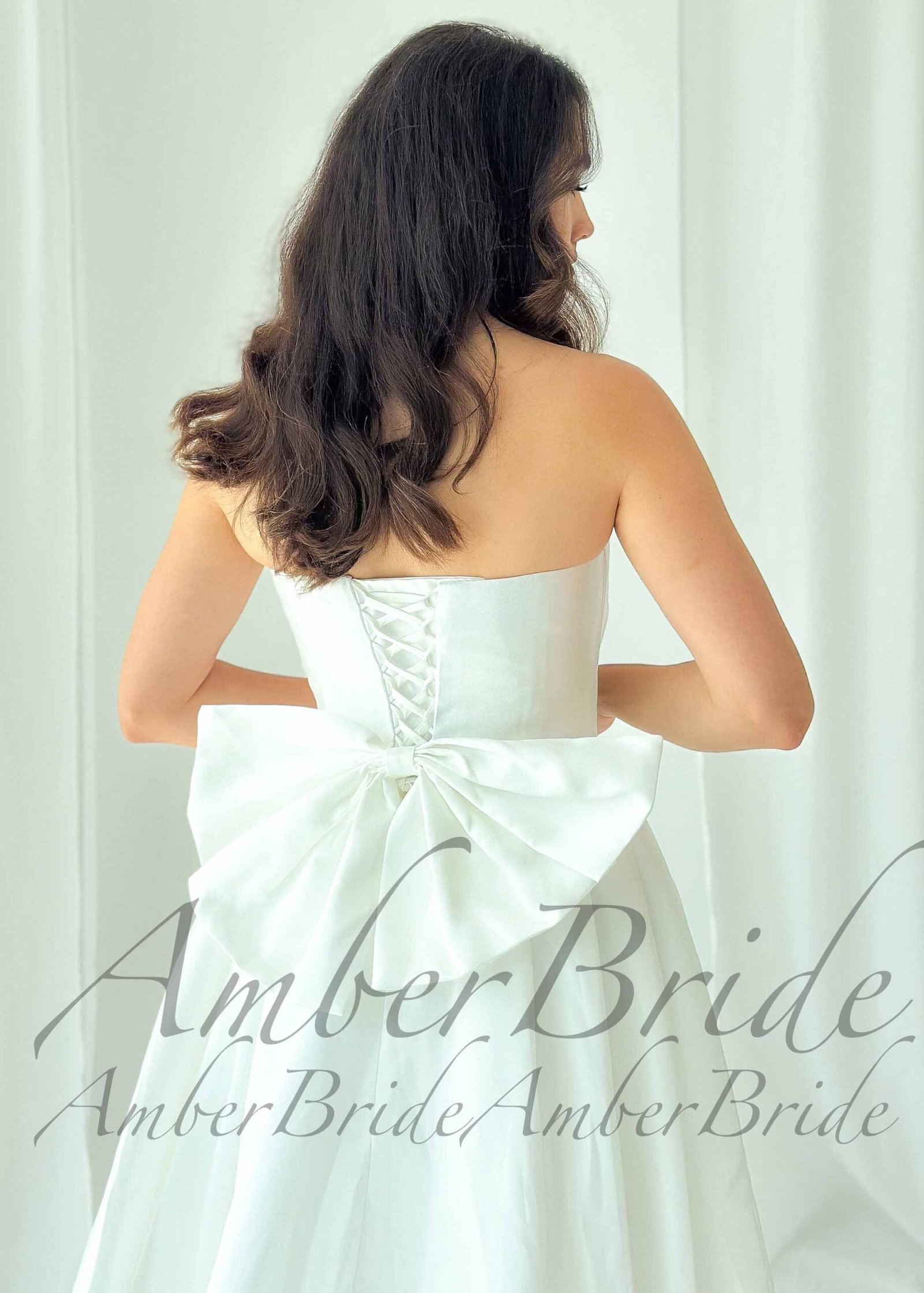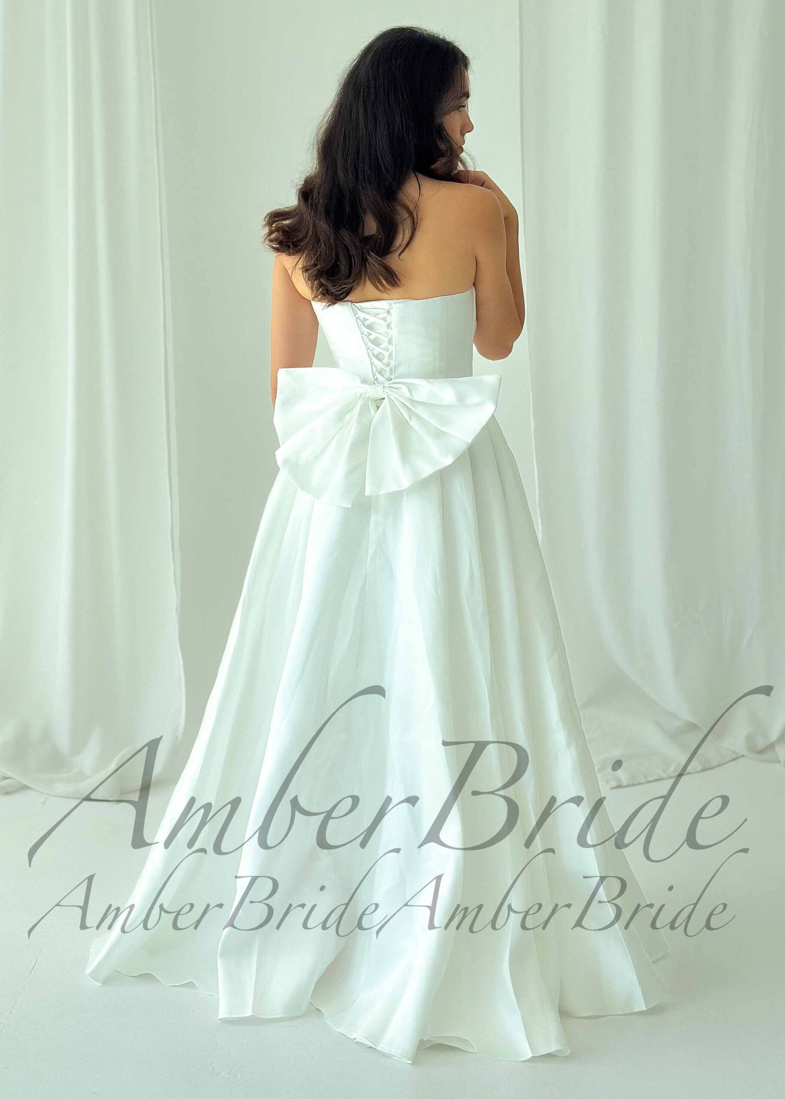 Klasikinė satino vestuvinė suknelė su nusegamu kaspinu