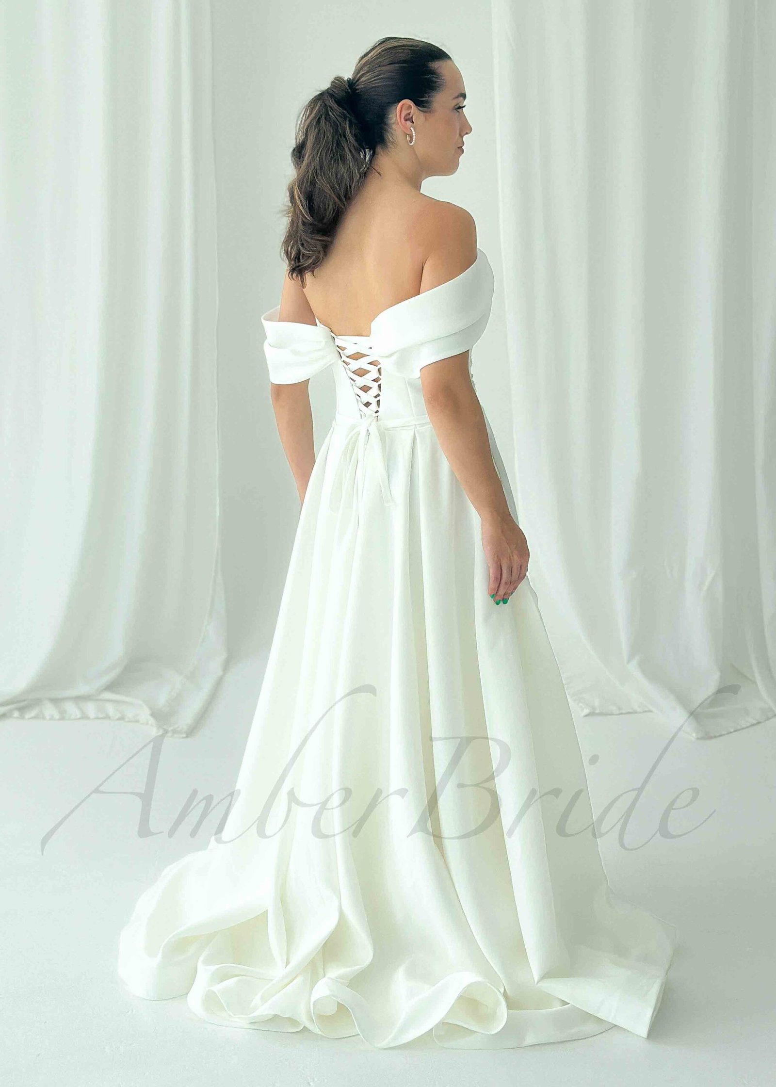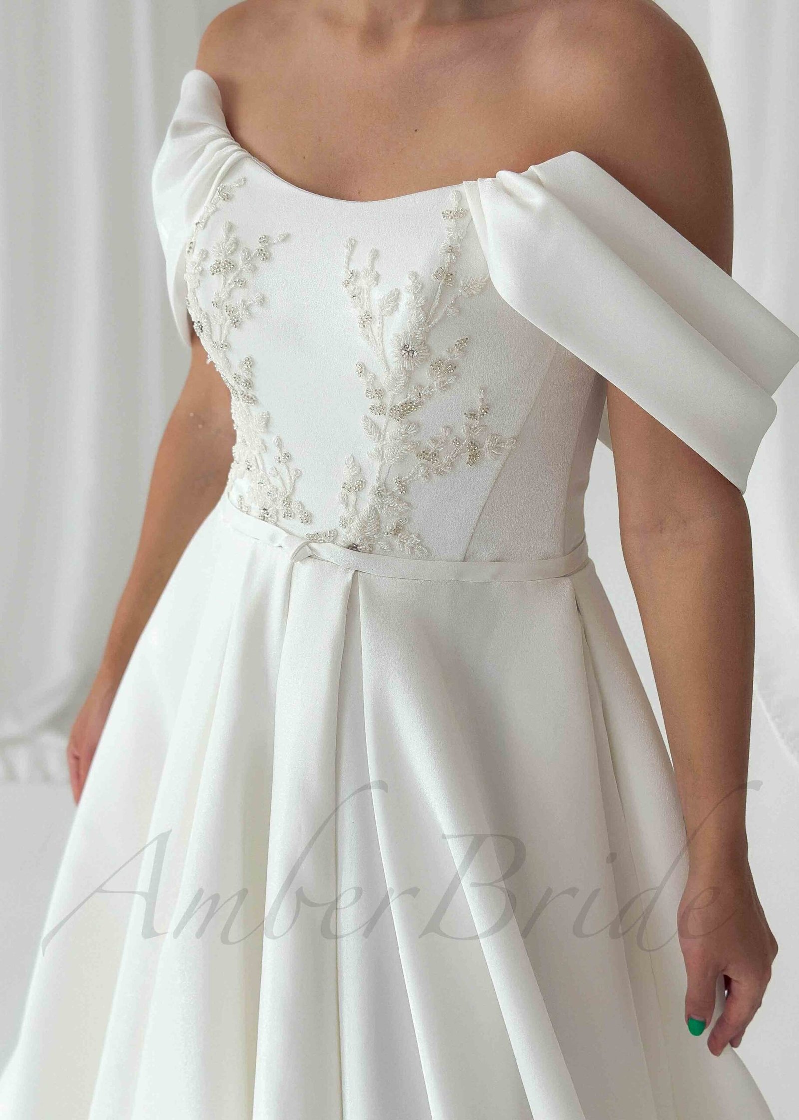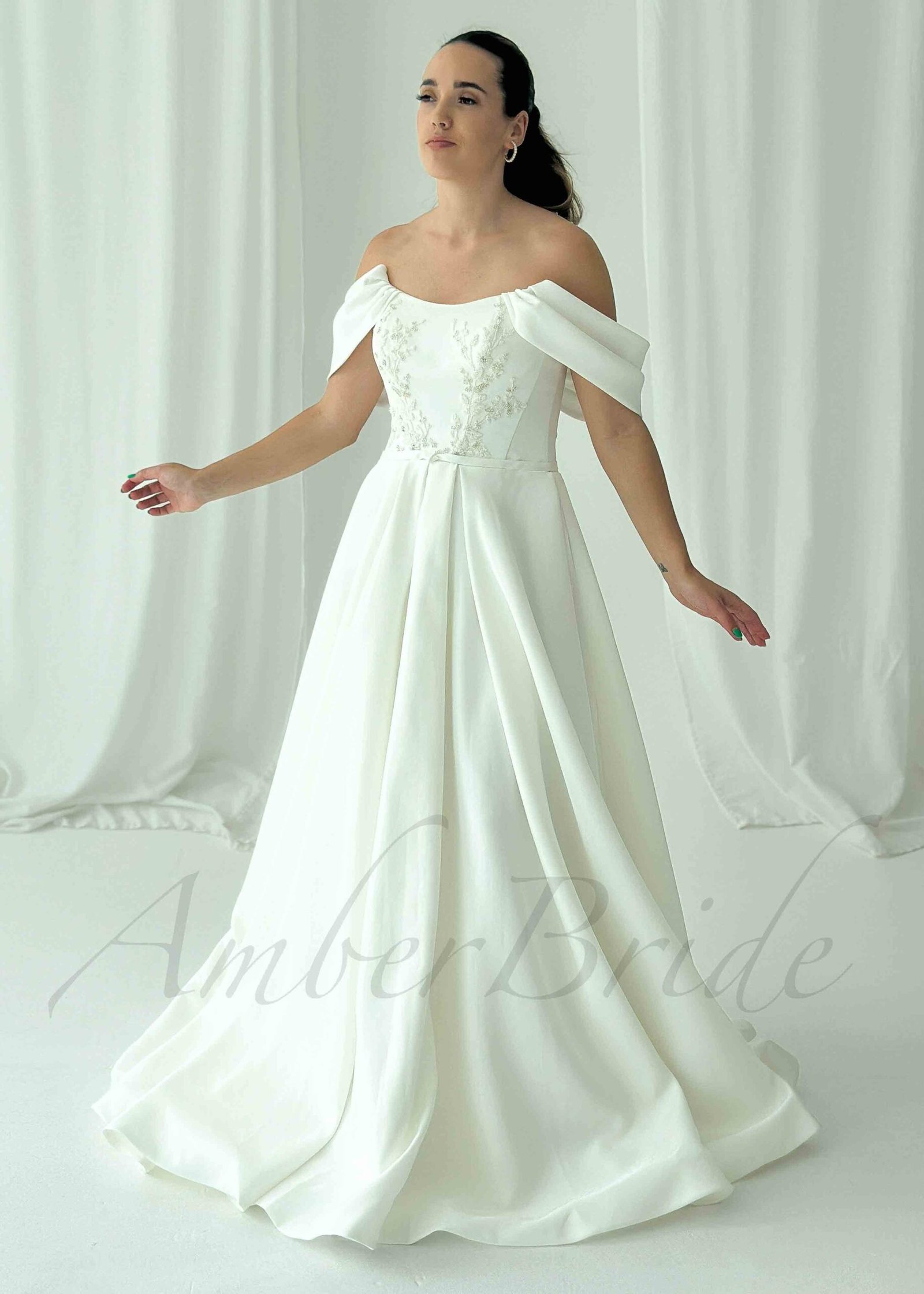 Klasikininė satino vestuvinė suknelė atvirais pečiais su gėlių elementais
