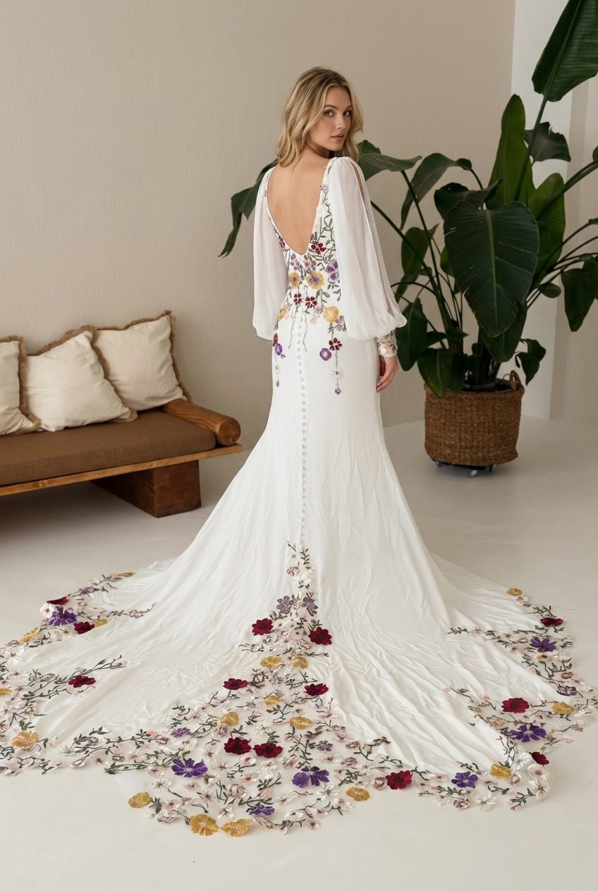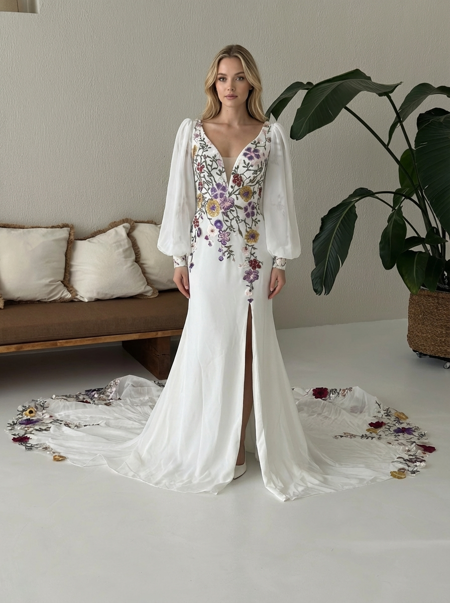 Modernaus dizaino vestuvinė suknelė su ilgomis rankovėmis