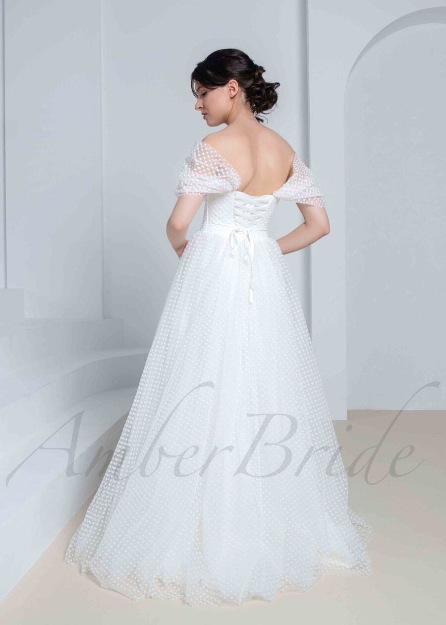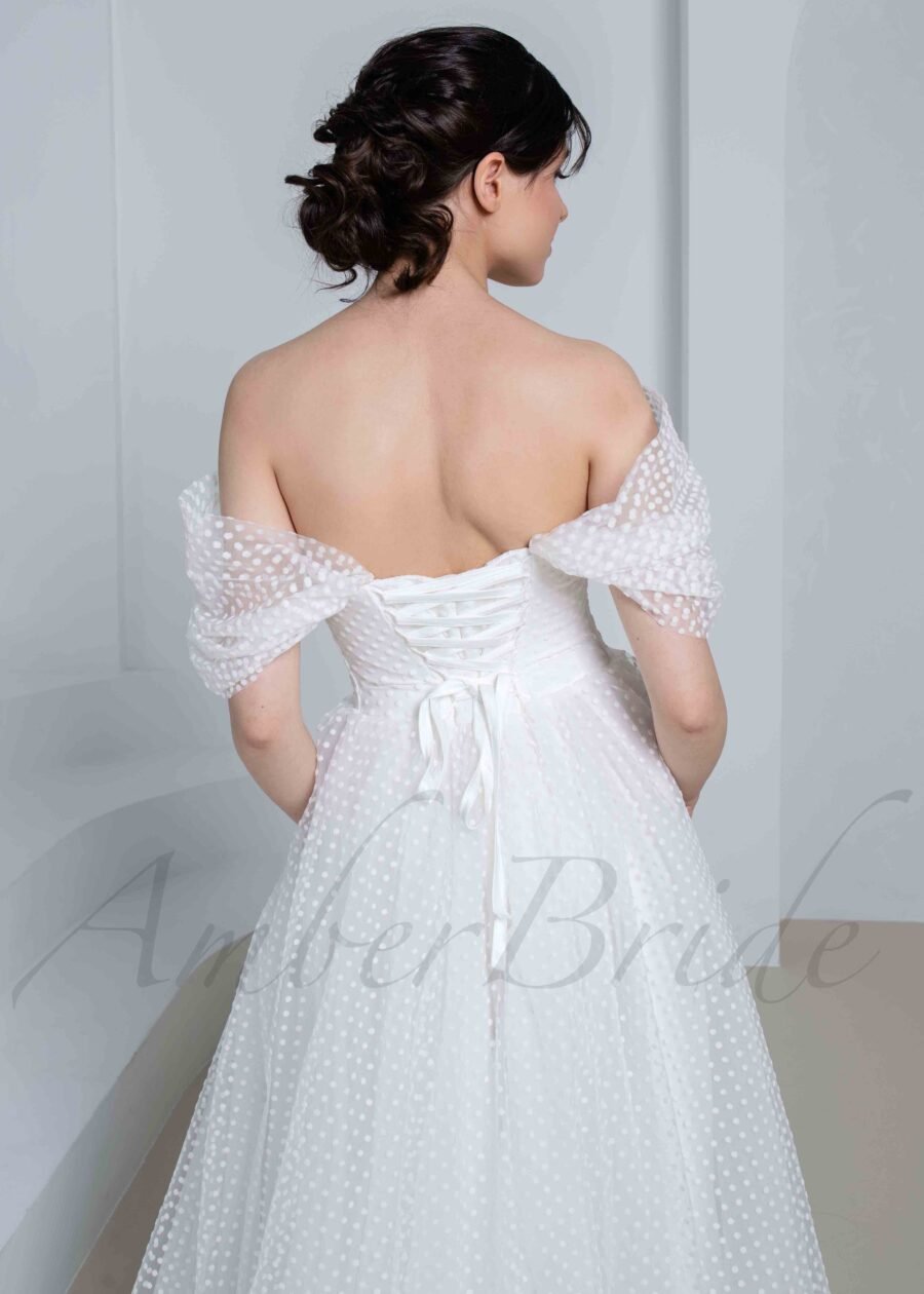 Paprasta taškuoto dizaino vestuvinė suknelė atvirais pečiais