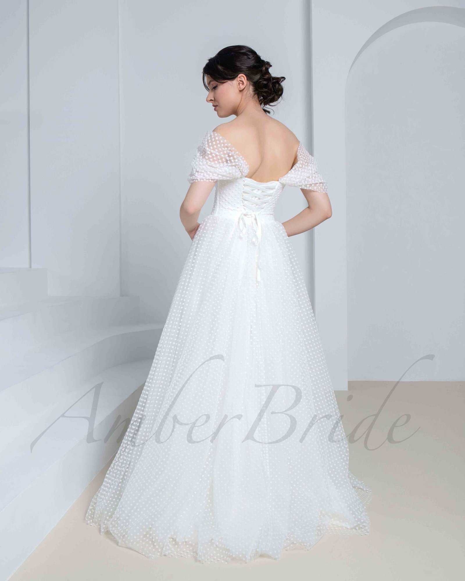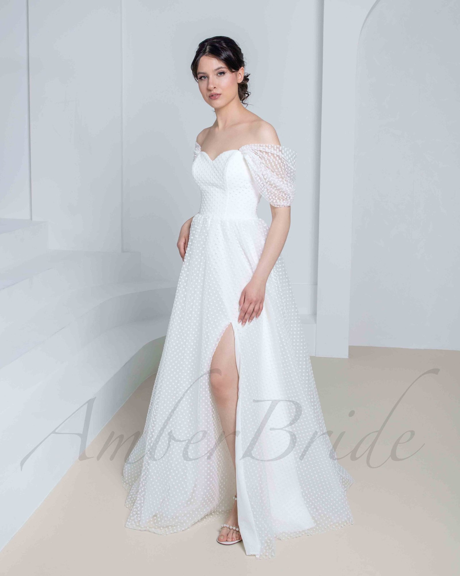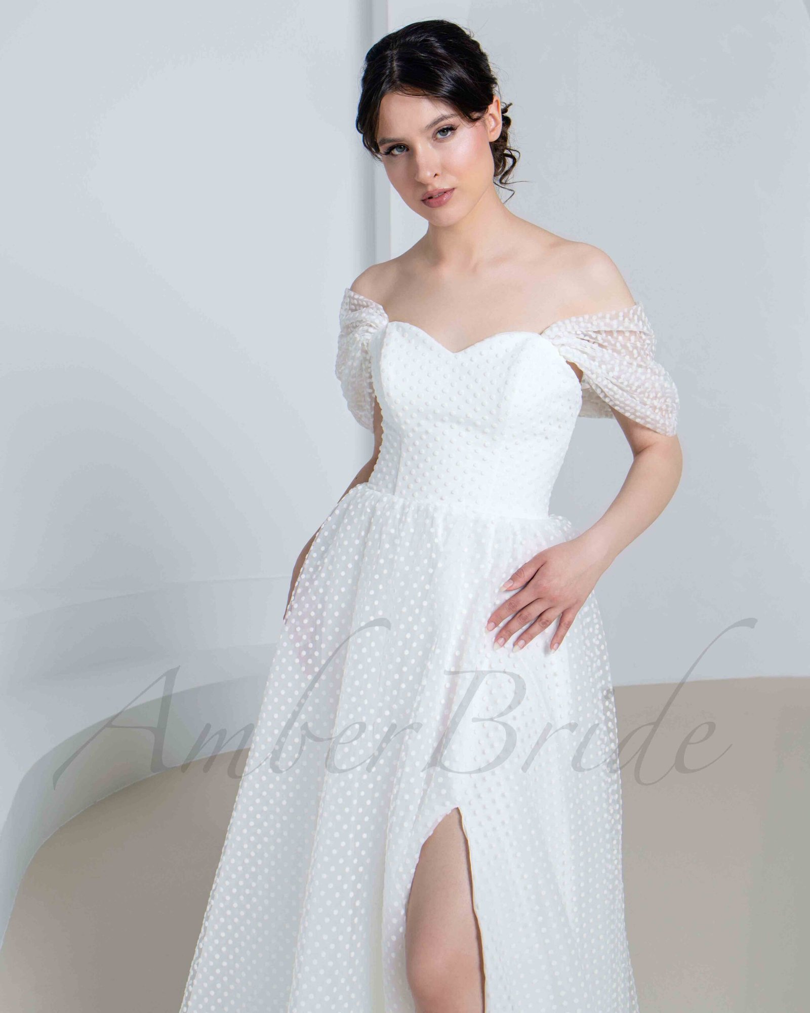 Paprasta taškuoto dizaino vestuvinė suknelė atvirais pečiais