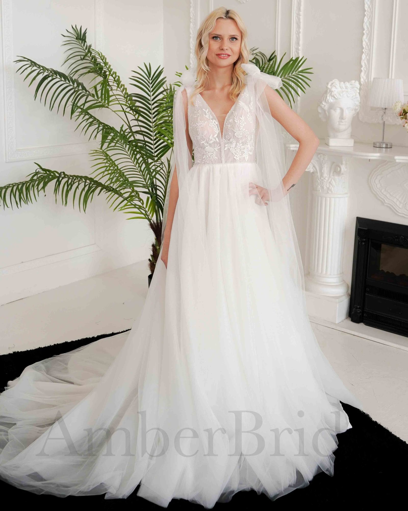 Romantiška tulio vestuvinė suknelė su gėlių dizainu ir atvirais pečiais