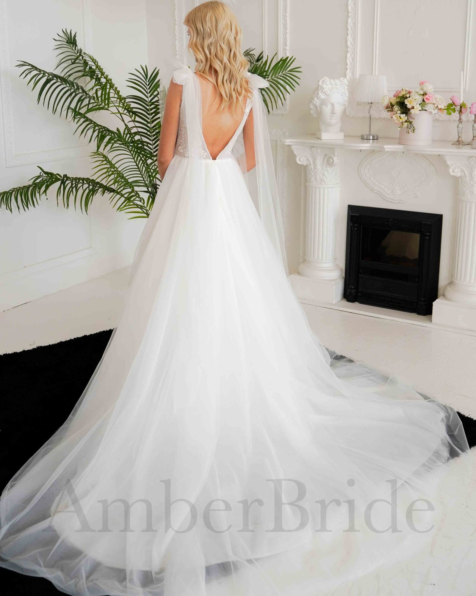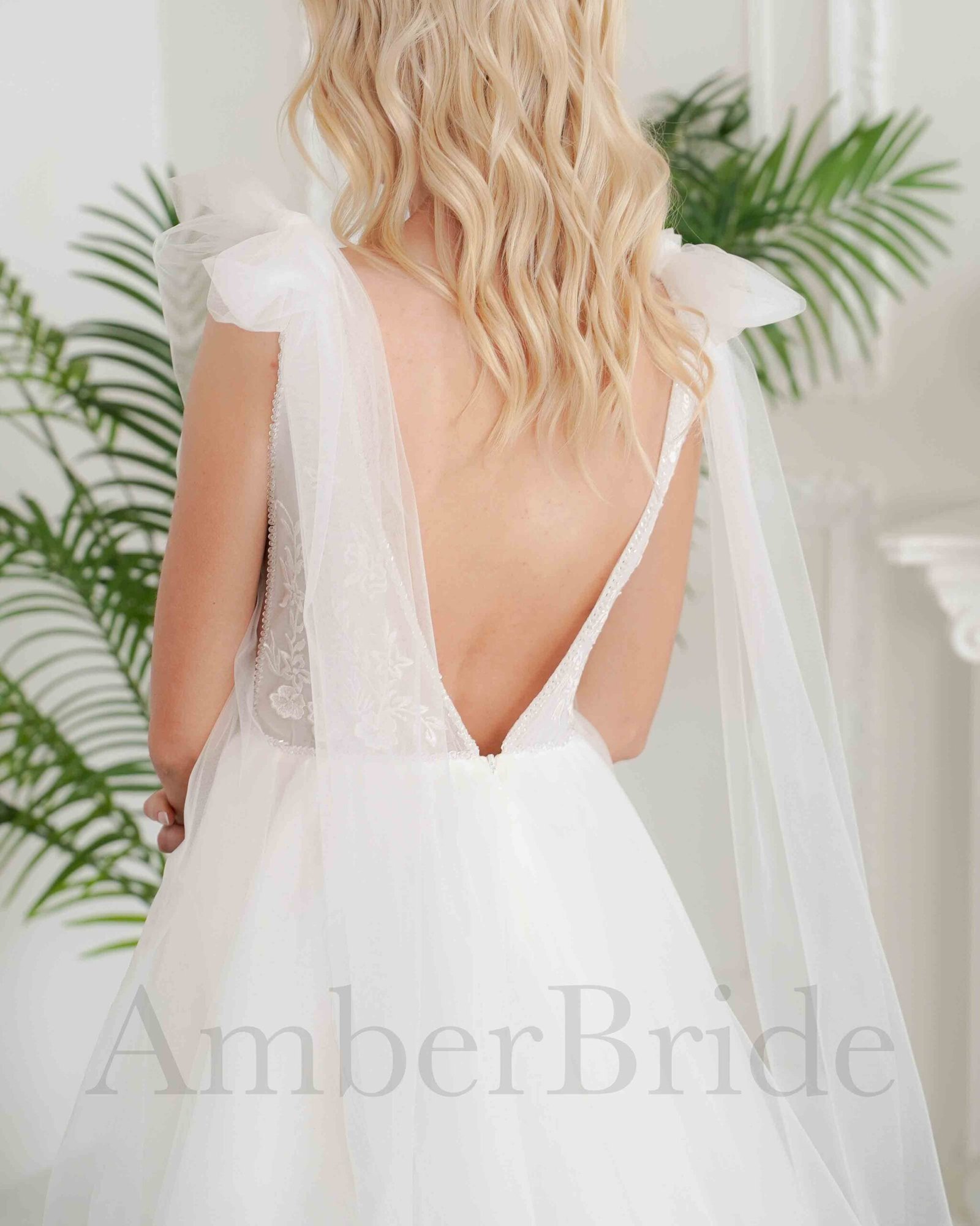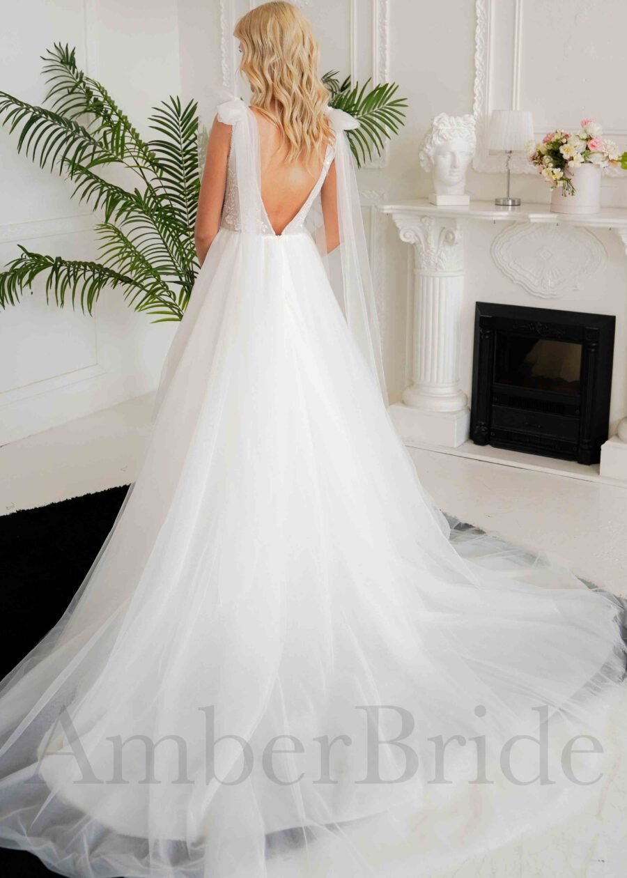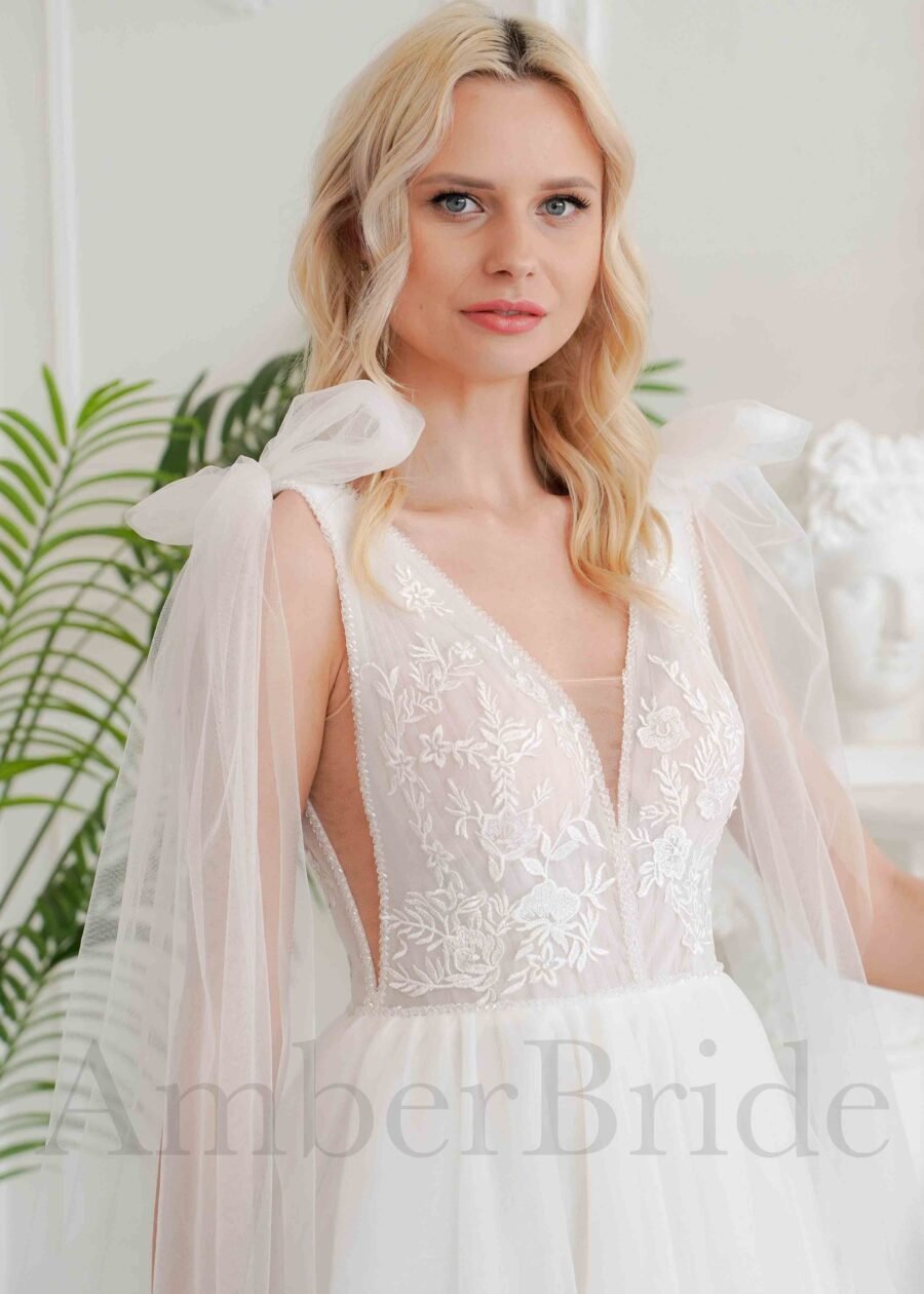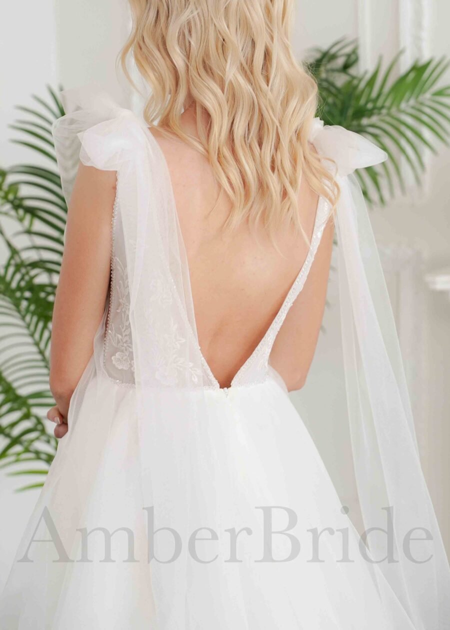 Bohemiška vestuvinė suknelė su tulio sijonu ir kutais