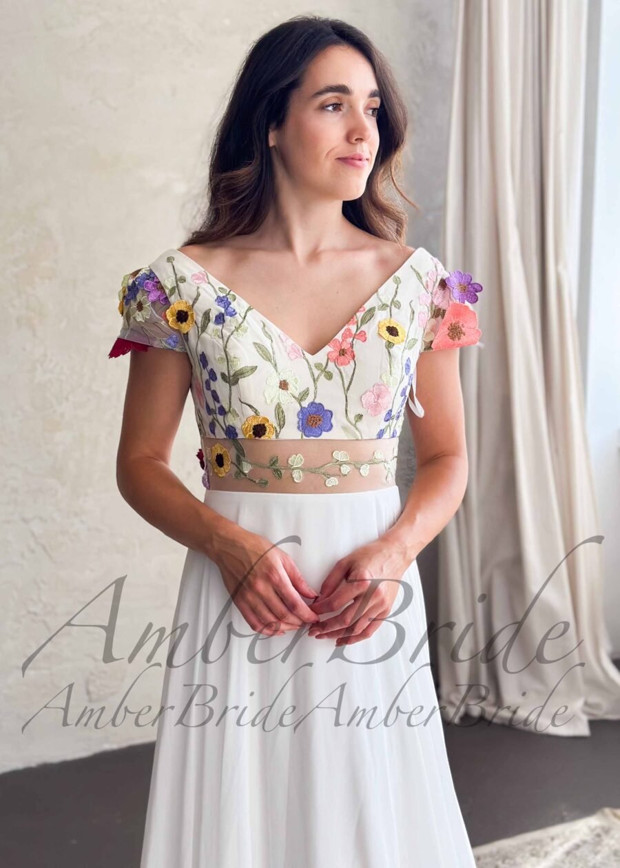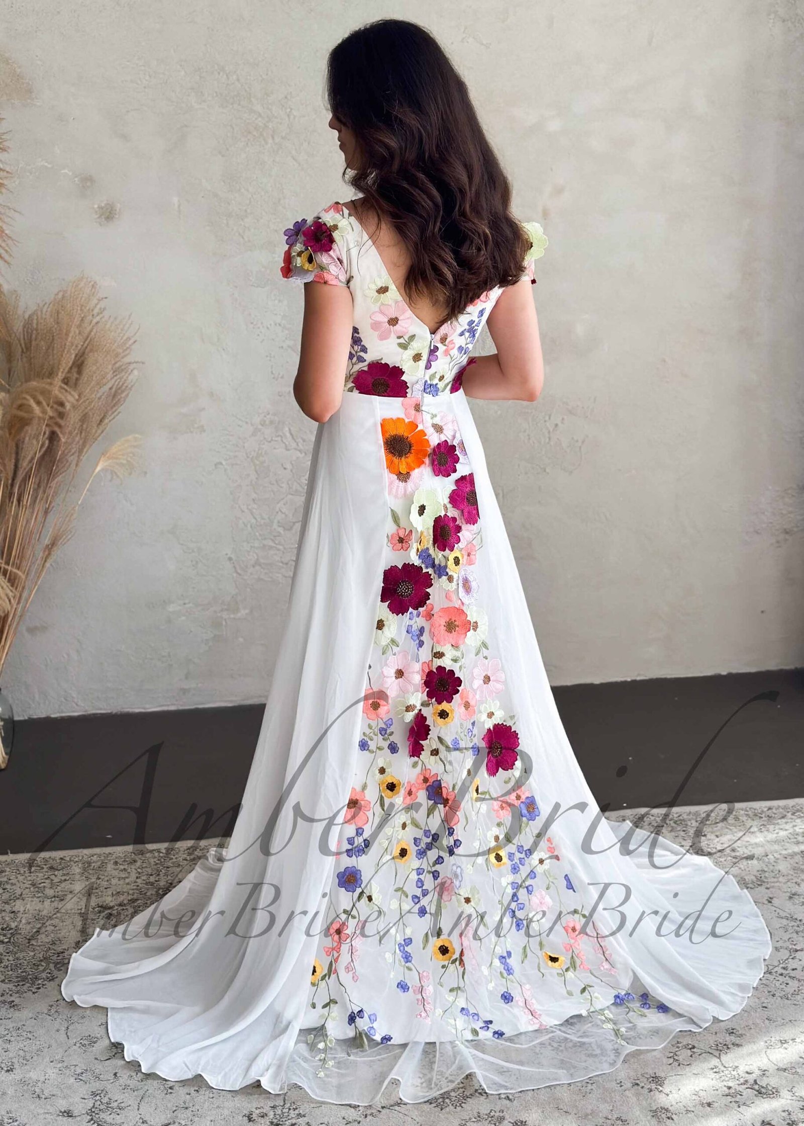 Romantiška šifoninė vestuvinė suknelė su spalvotomis gėlėmis ir trumpomis rankovėmis