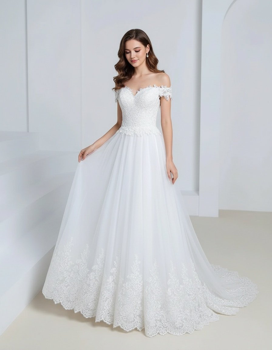 Romantiška tulio vestuvinė suknelė su gėlių dizainu ir atvirais pečiais