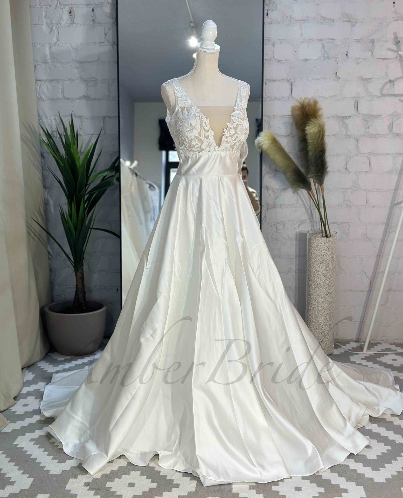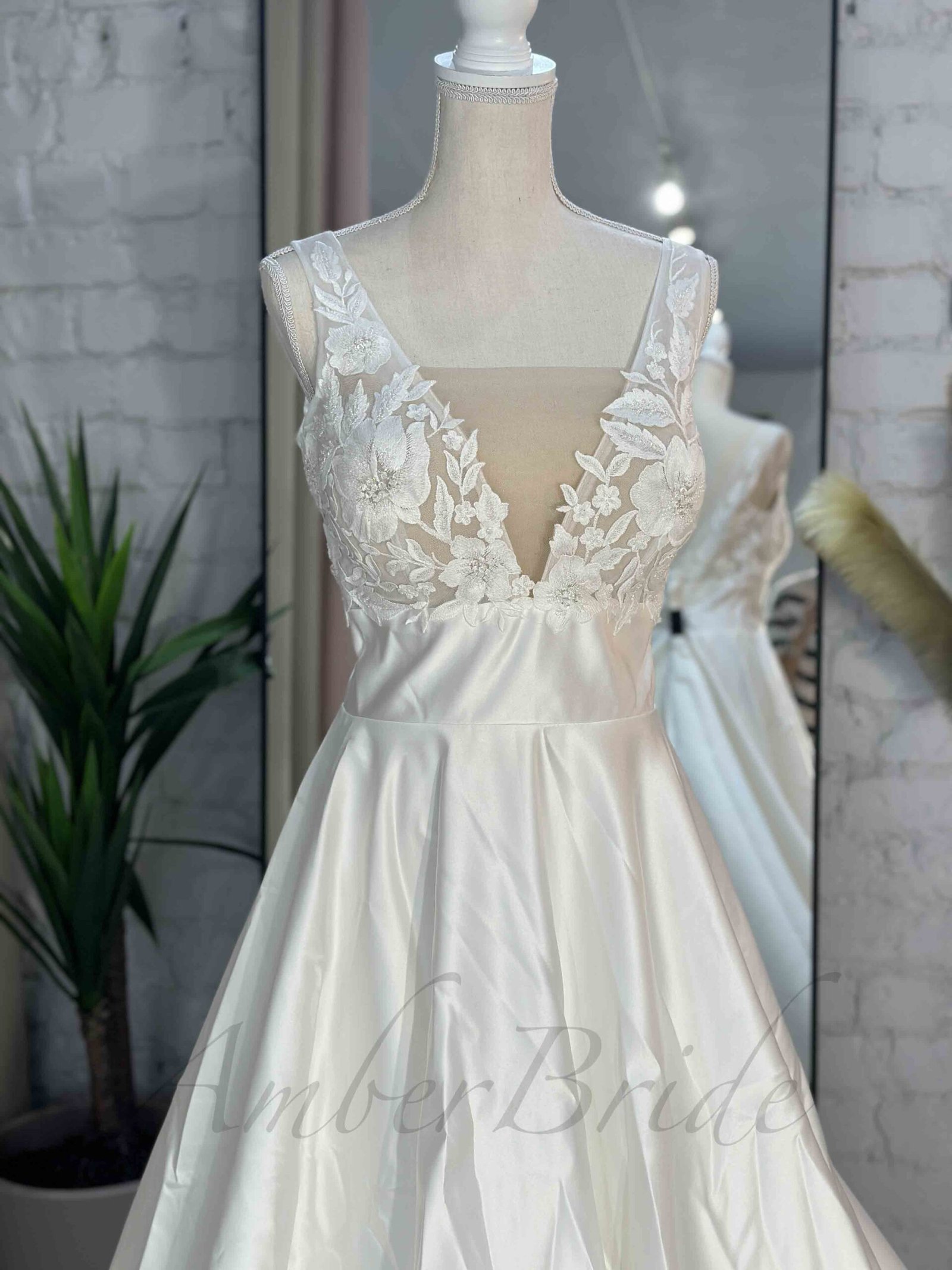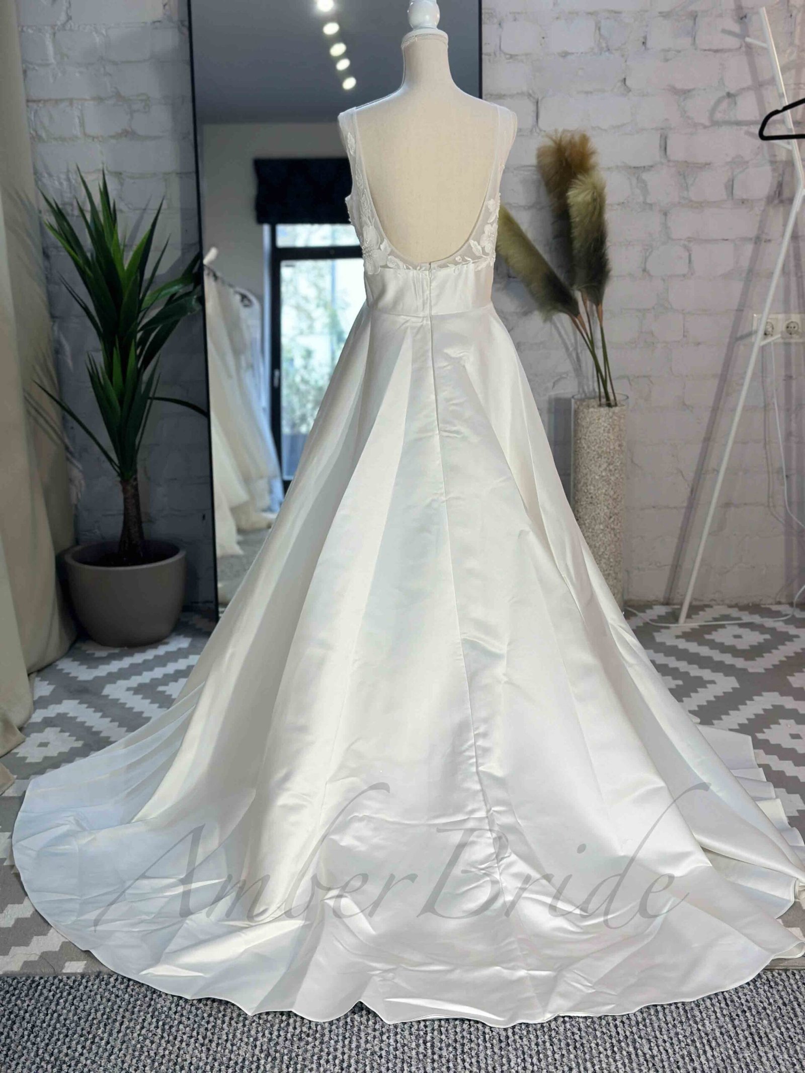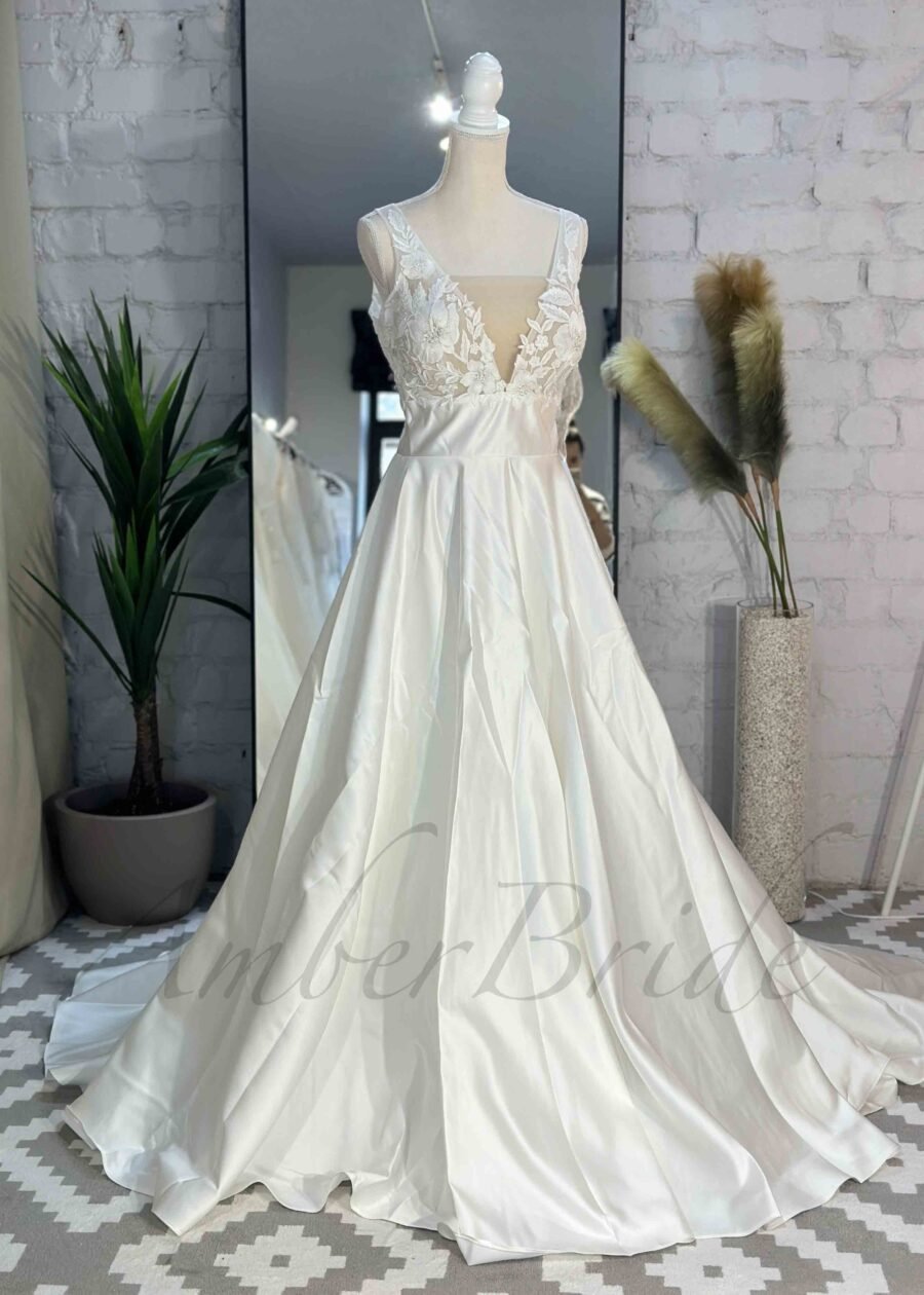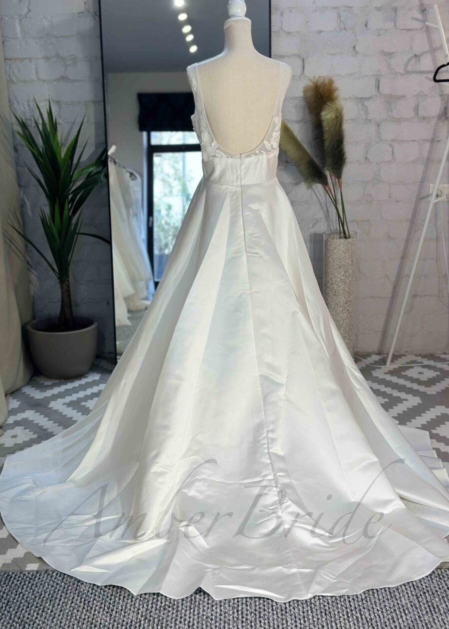 Romantiško stiliaus gėlėta suknelė su satino sijonu ir atvira nugara